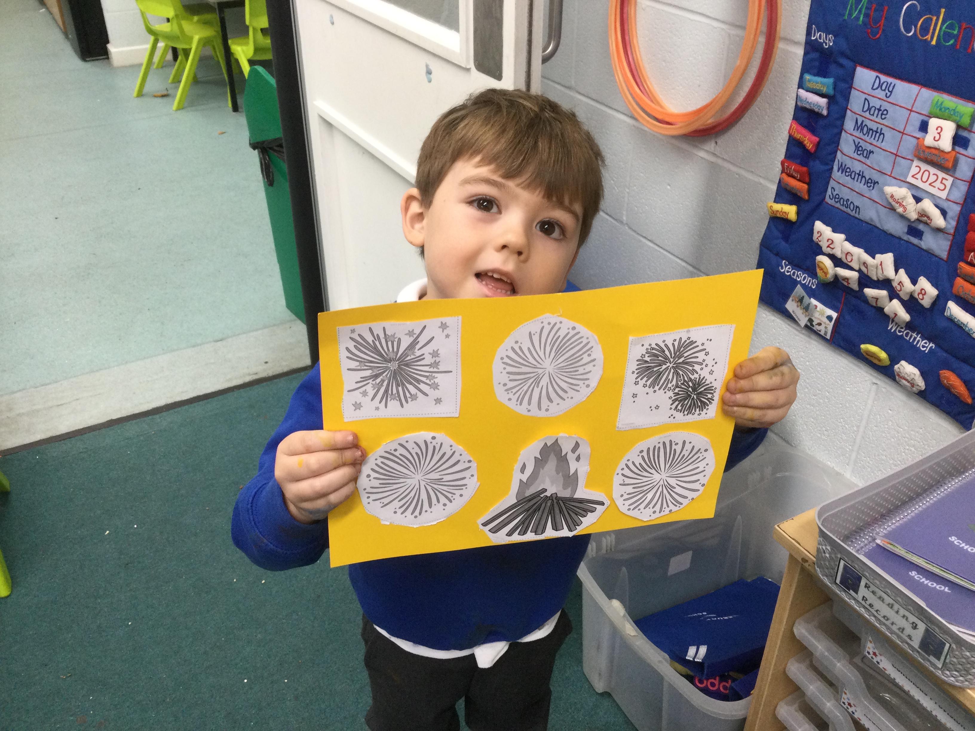 In Discovery Time we have been drawing chalk fireworks outside, making shape pictures, printing fireworks using toilet rolls and playing firework snap!