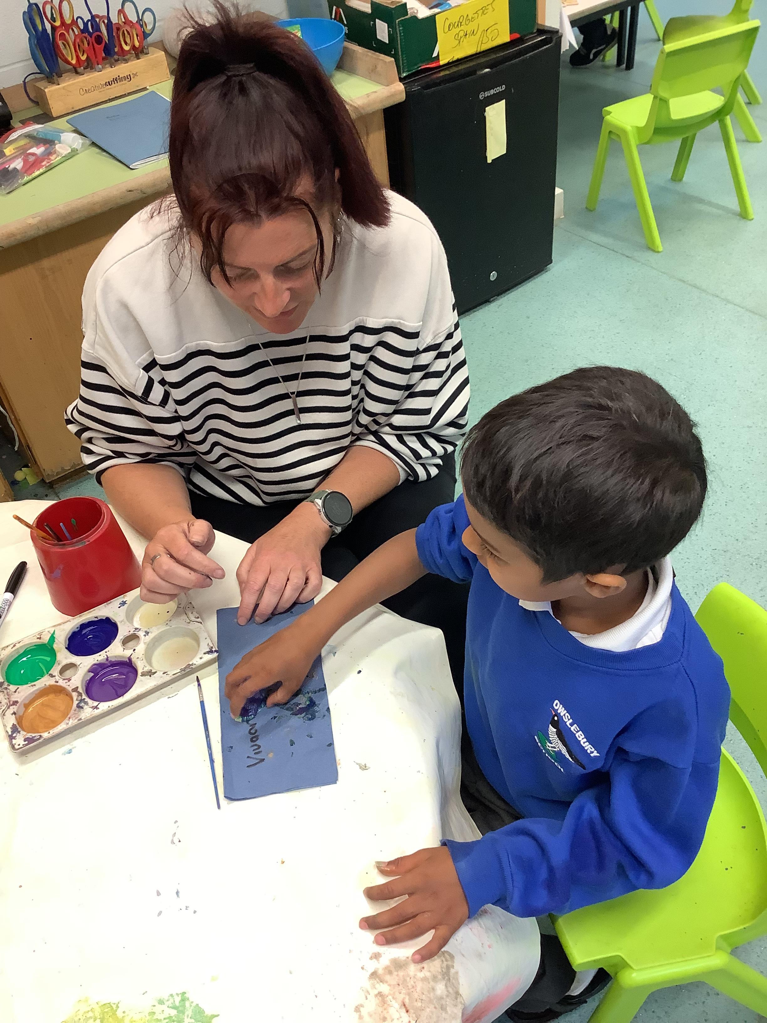 In Discovery Time we have been making sandcastles, finding number pebbles in the sand making large boats using the wooden blocks and painting shells. We also took part in some sand painting after visiting Hensting class to see their artwork using sand.