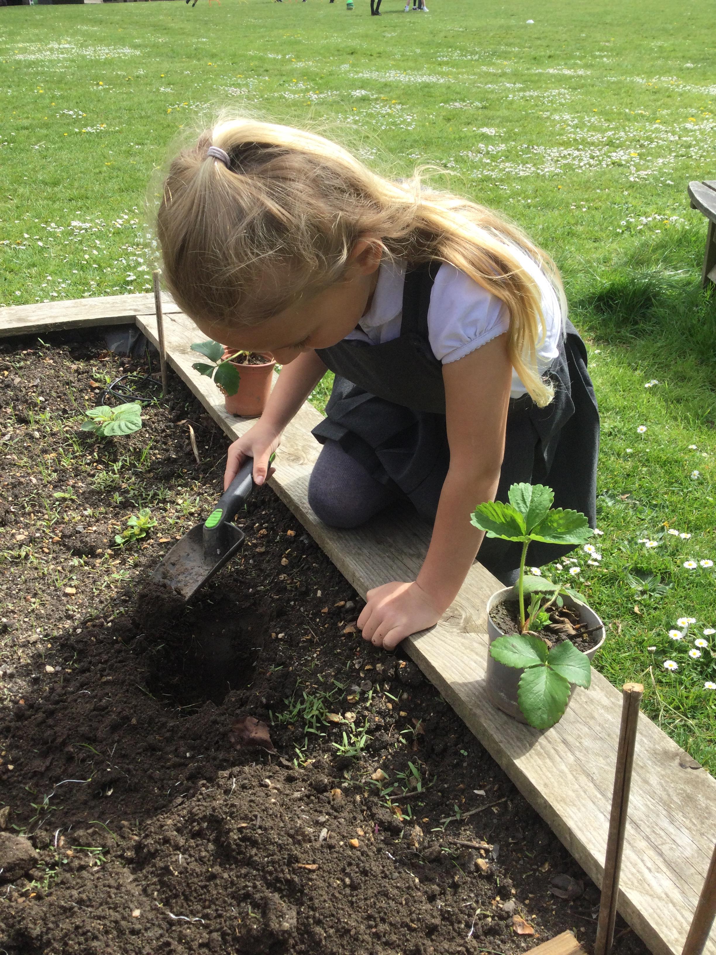 We planted strawberry plants in our raised beds and made dinosaur footprints in the paint comparing their size and shape.
