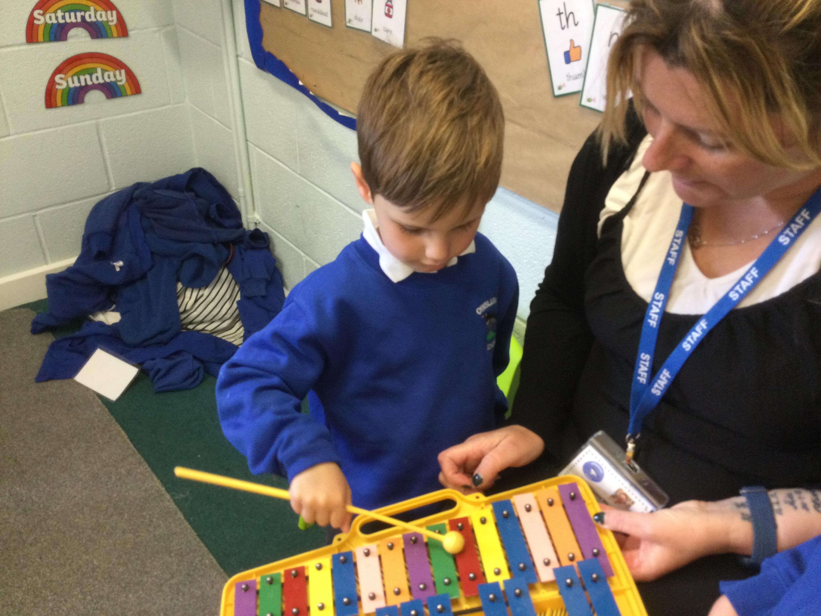 In music this week we explored the glockenspiels after talking about music we enjoyed and pitch. We also talked about the genre 'funk music' and how sometimes it makes us want to dance. We played a game where one child played a note and we had to find it on our glockenspiels.