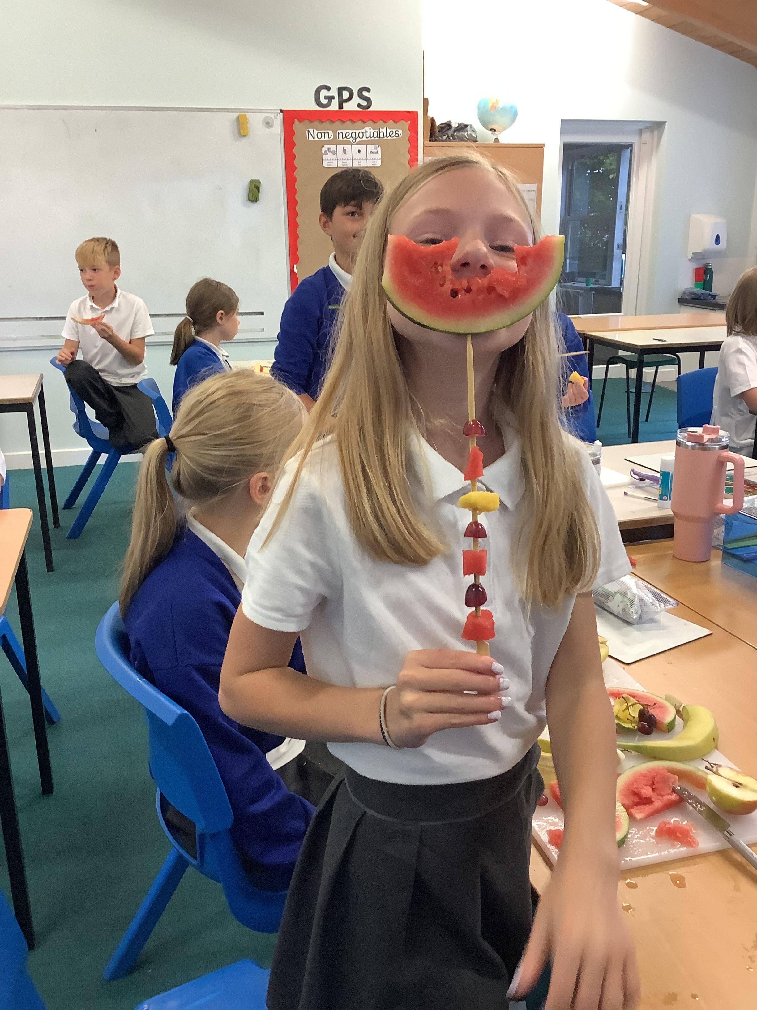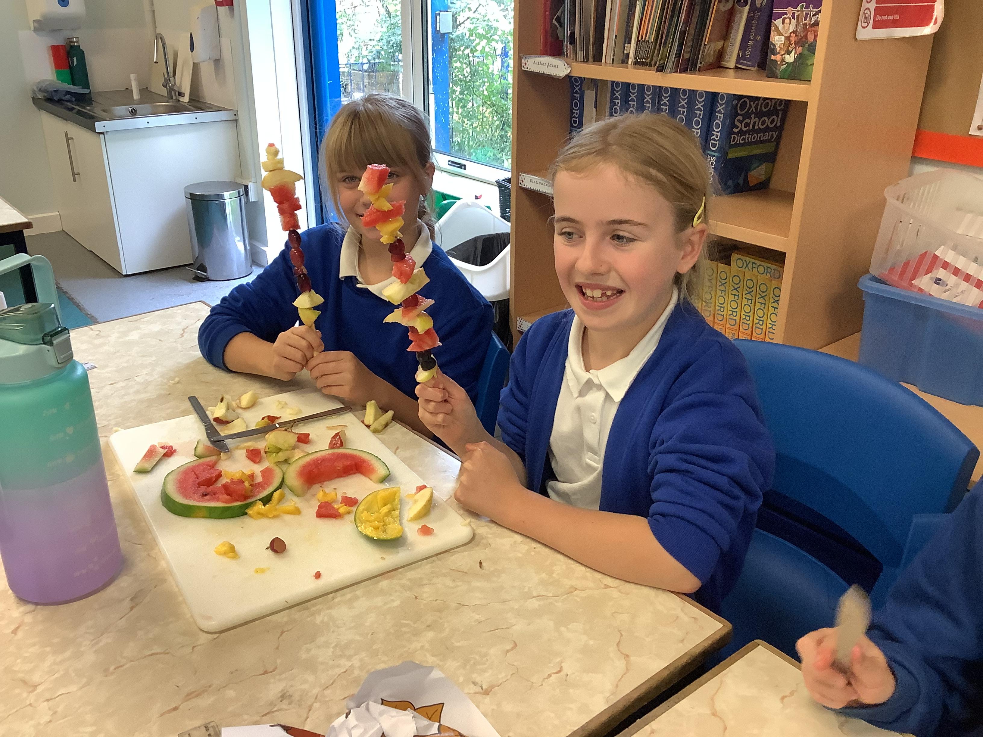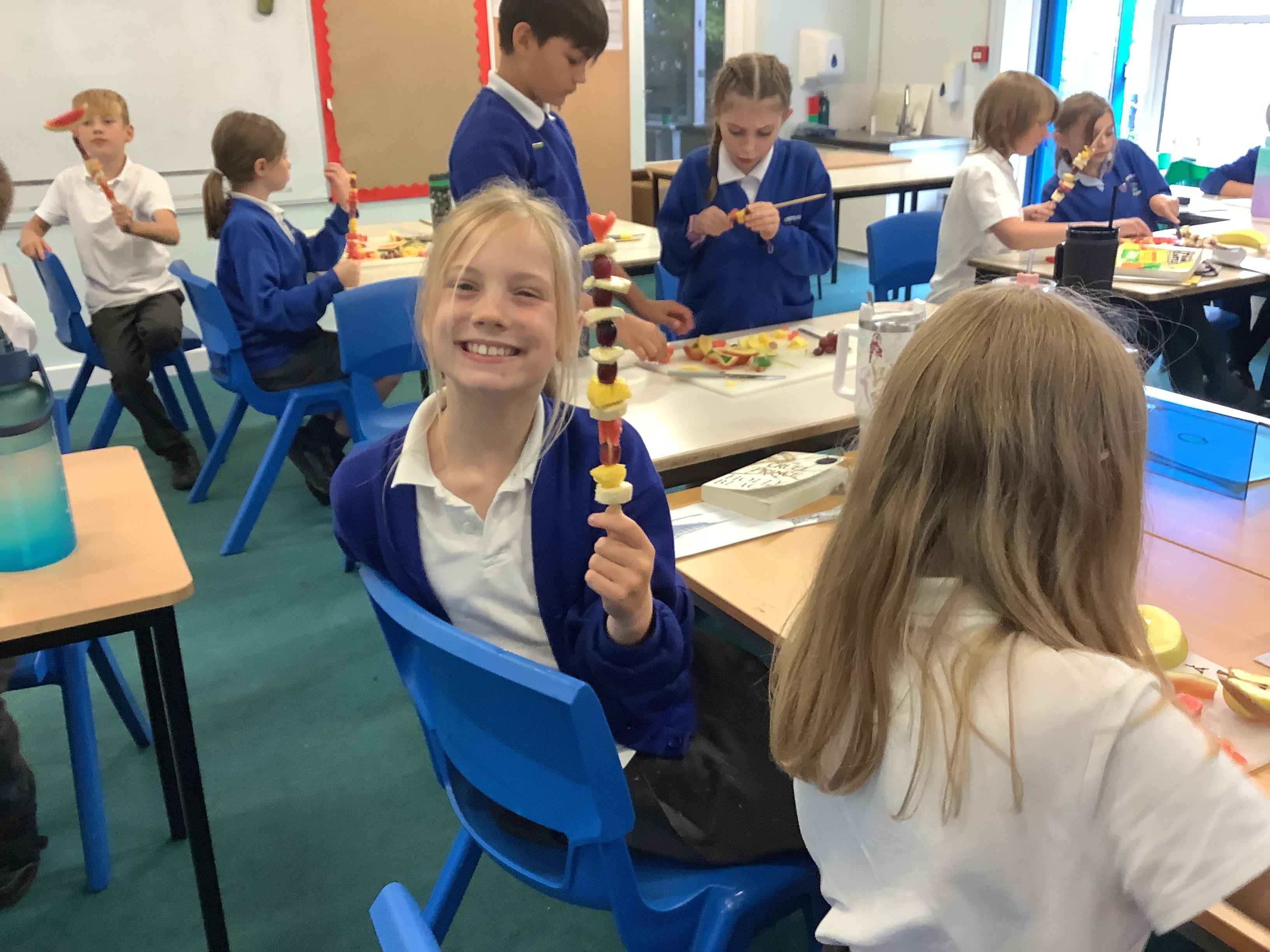 As mentioned in the learning forecast, the children are investigating healthy eating in DT this half term. We have looked at the balanced diet and what each compounded does as well as the dangers of cross contamination. During our hygiene lesson of cross contamination we also looked at what could occur if we weren't safe with our food - this included specific illness such as food poisoning and salmonella. We have now started to experiment with food looking at different skills including: knife skills, hot food elements, reading instructions, measuring ingredients and completing a full dinner element. The children had a lot of fun developing their cutting skills when creating fruit kababs.