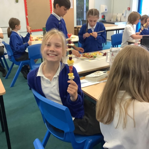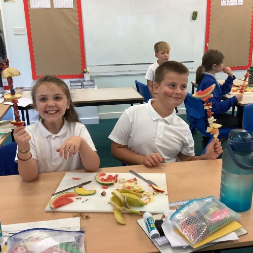 As mentioned in the learning forecast, the children are investigating healthy eating in DT this half term. We have looked at the balanced diet and what each compounded does as well as the dangers of cross contamination. During our hygiene lesson of cross contamination we also looked at what could occur if we weren't safe with our food - this included specific illness such as food poisoning and salmonella. We have now started to experiment with food looking at different skills including: knife skills, hot food elements, reading instructions, measuring ingredients and completing a full dinner element. The children had a lot of fun developing their cutting skills when creating fruit kababs.
