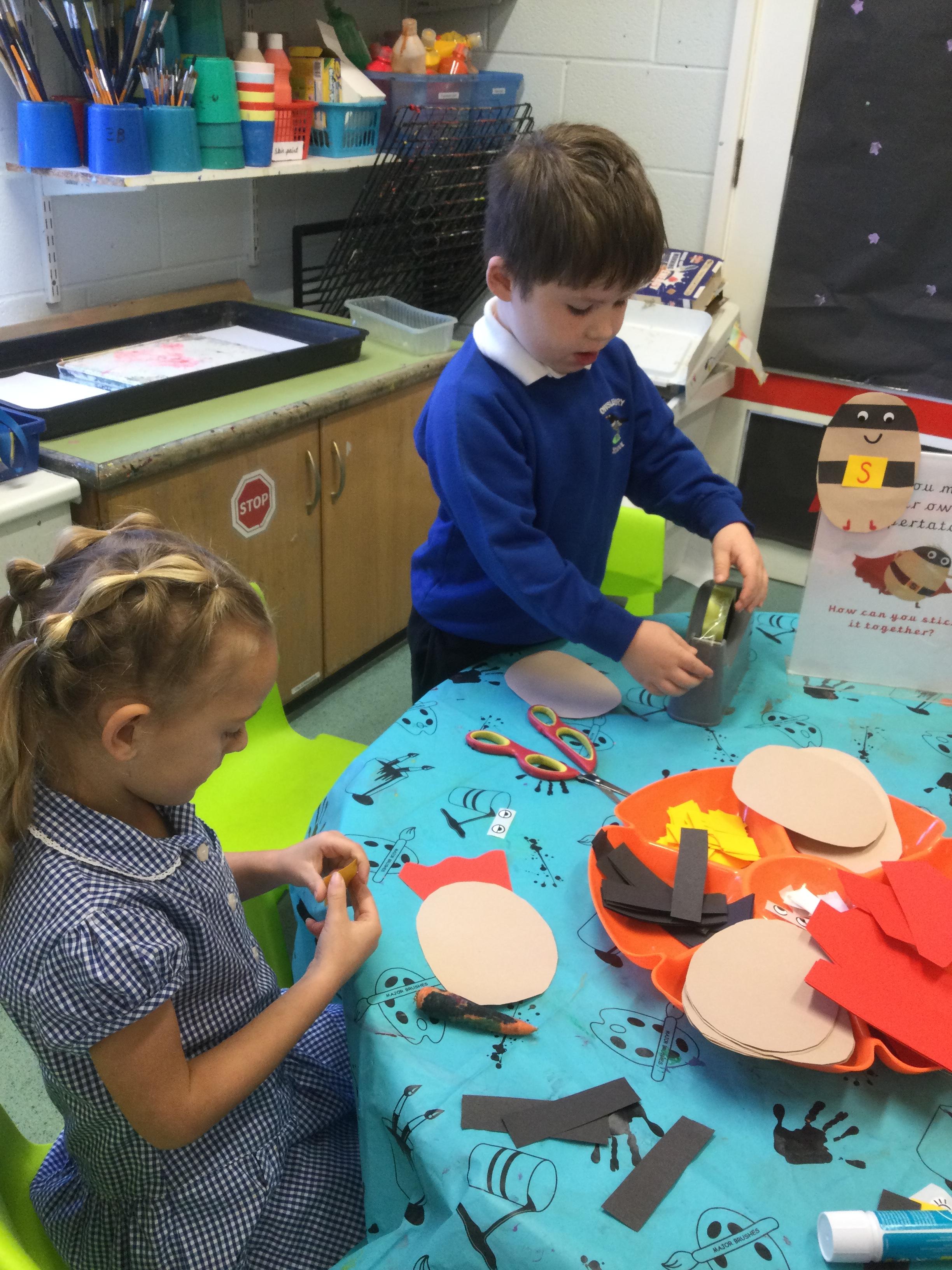 For our activities this week we sorted the evil peas into the correct numbered pots, tied up the Evil Pea using shoe laces, created our own supper veggies and wrote to the Evil Pea to ask him to stop making mischief! We enjoyed making our own Supertato and other Super Veggies in the creative area- we thought about different ways we could fix the paper together. Some of us even joined the bad guys!