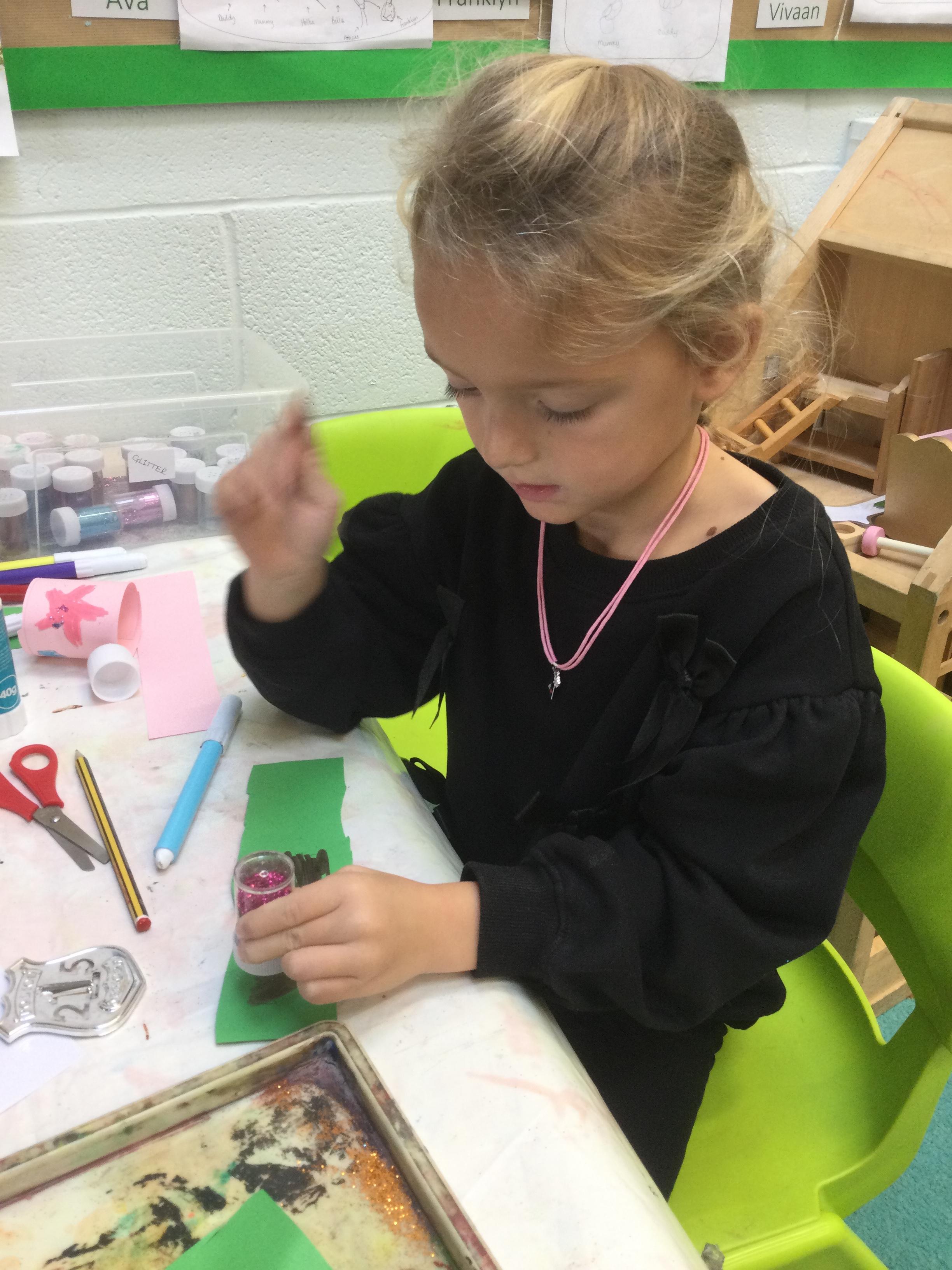In the creative area, we have used a range of techniques to create our own firework displays- we used stamping, glitter and doodling. This was great for our fine motor skills.