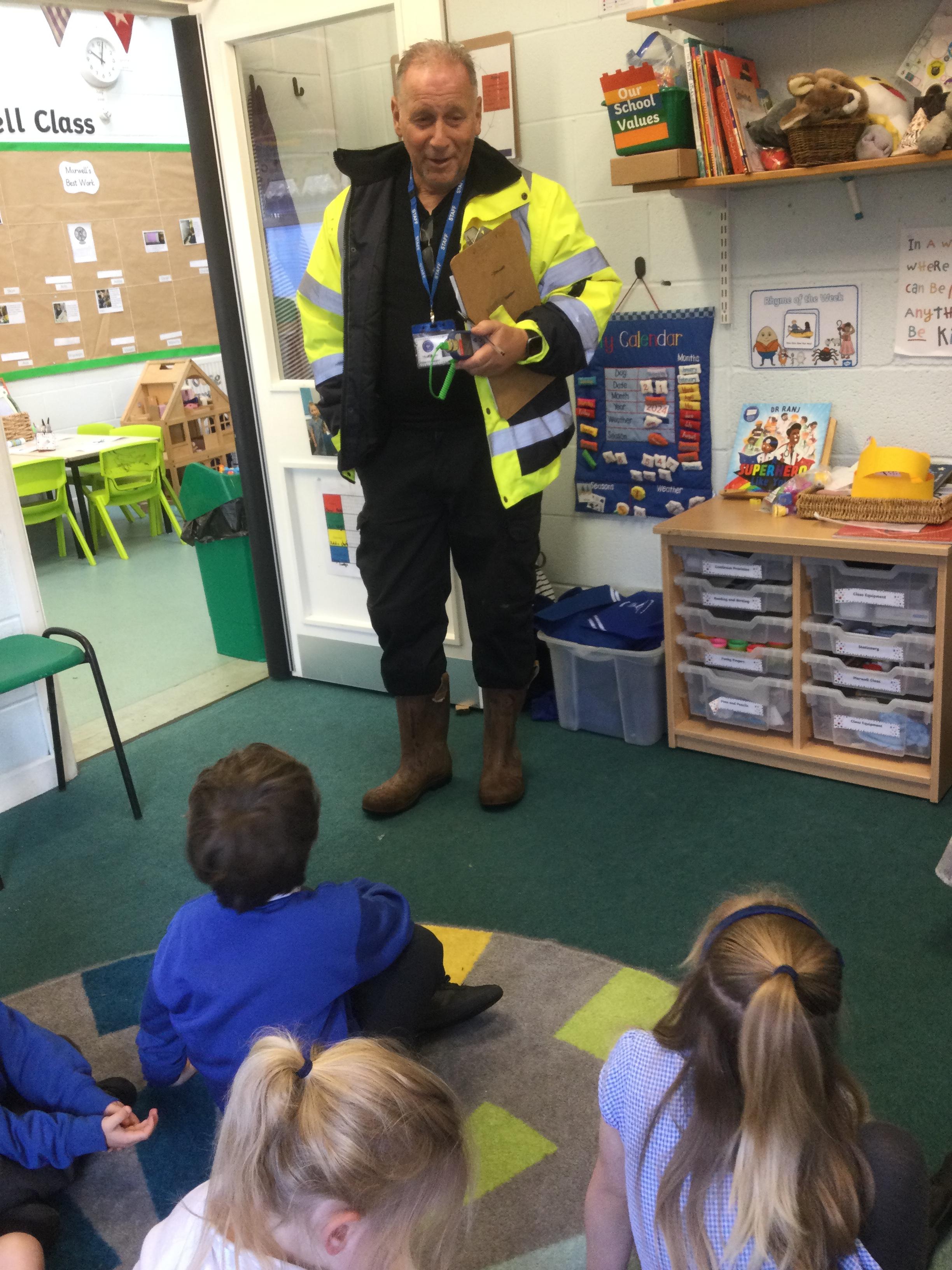 He spoke to us about the jobs he does to look after our school and make sure it is a safe place for us to learn and play. He showed us the clothes he wears including a hi vis jacket and hard boots. He also told us about how he unblocked our sink after it had too much sand in it!