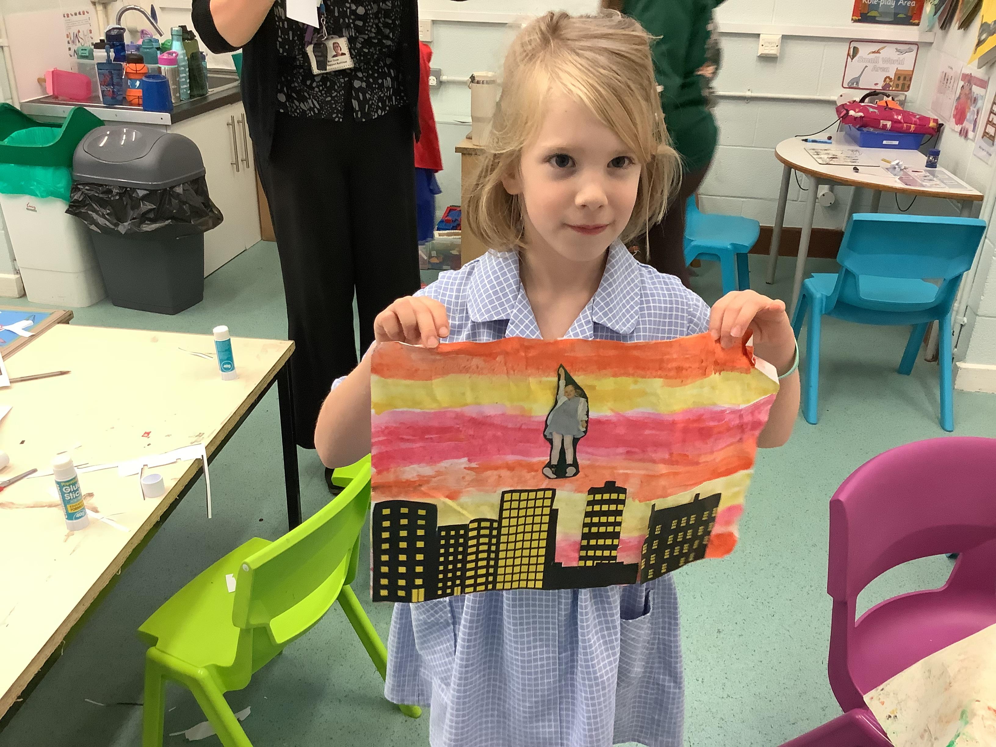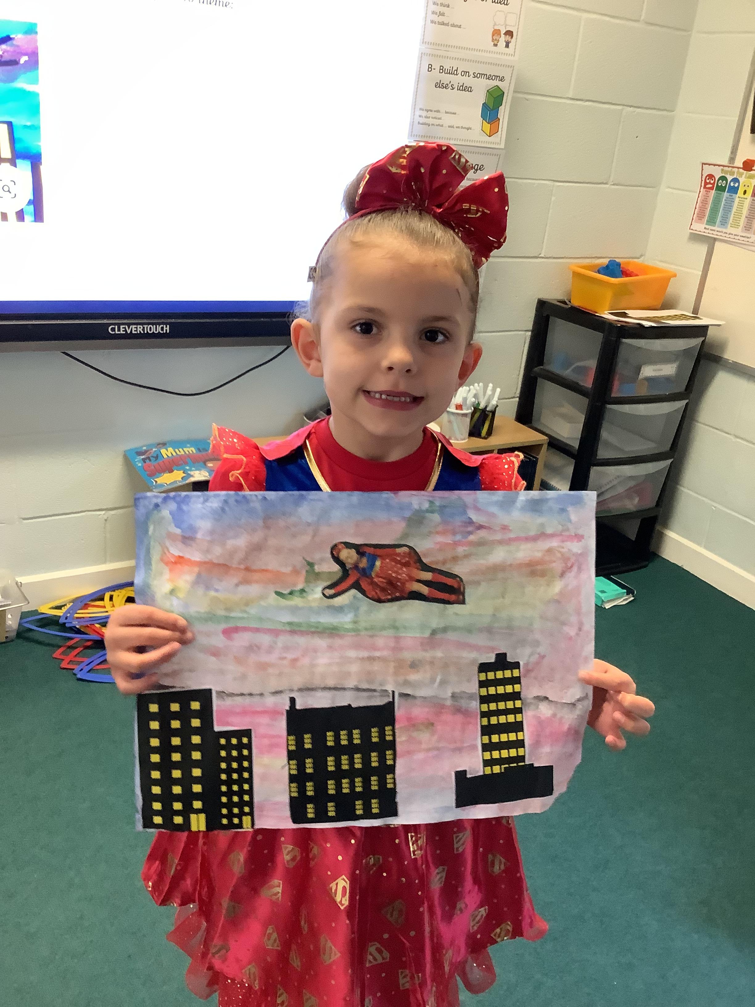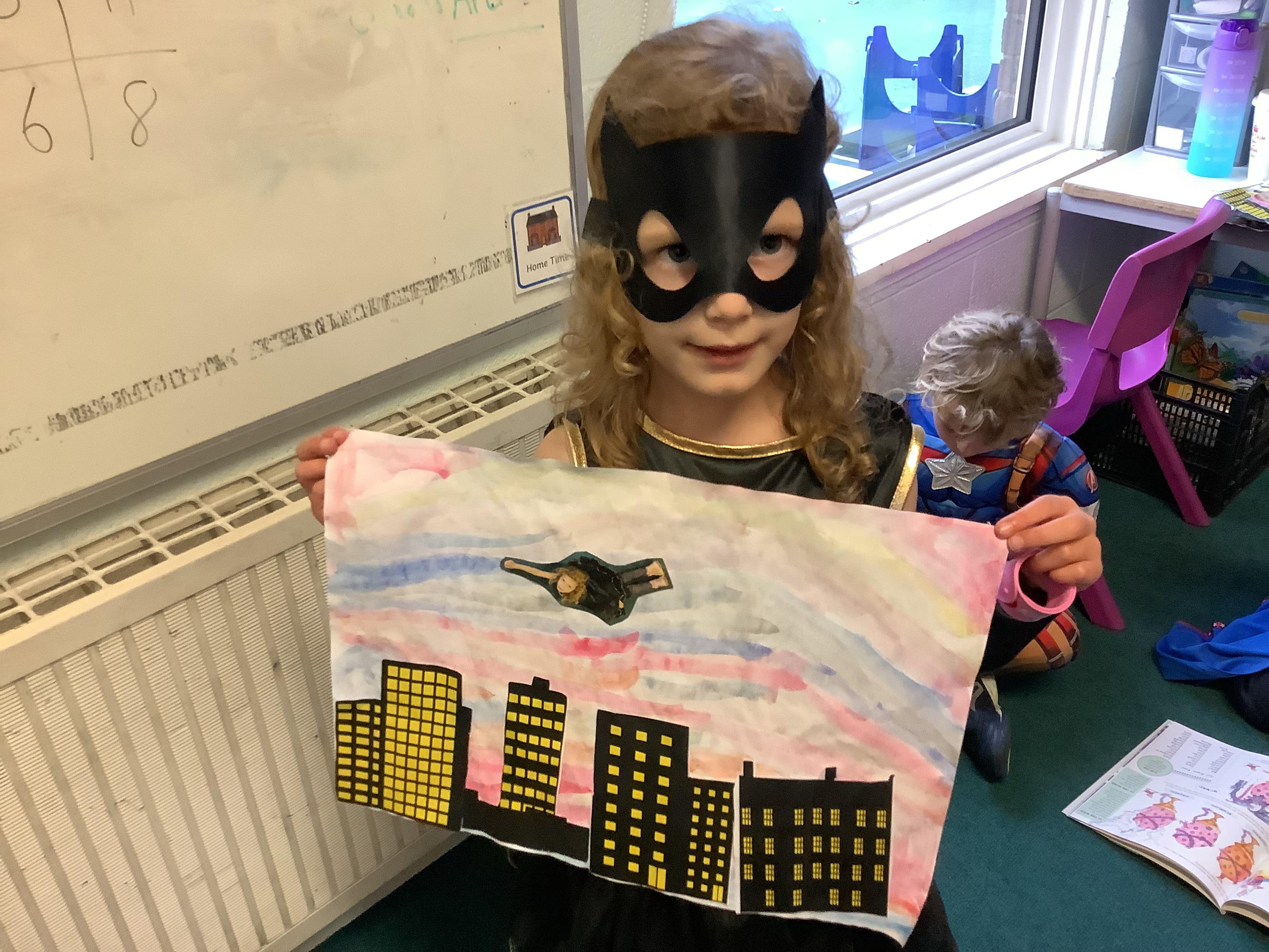 Later in the day, we made some superhero art where we were flying through the sky! We used watercolour paints to create a magical background, then stuck down images of buildings and ourselves in our best superhero poses flying through the sky to save the day. We were all very excited to have our Art work displayed in the classroom. We also designed our own superhero badges/shields and played some great superhero themed games.