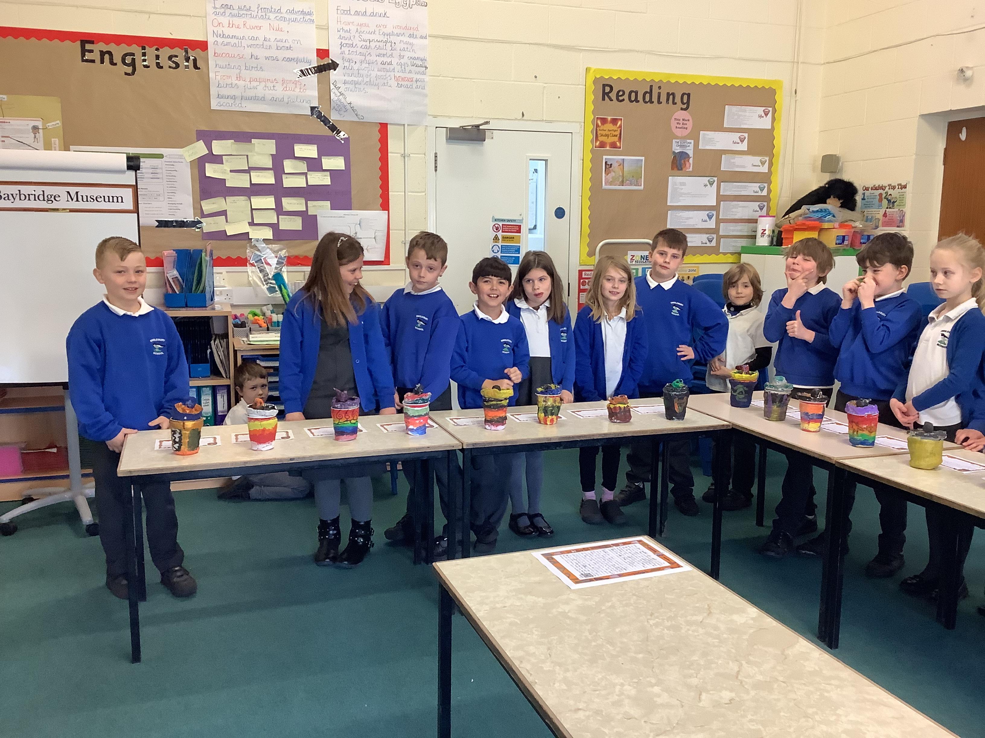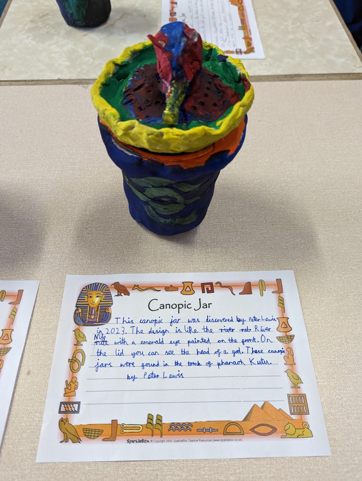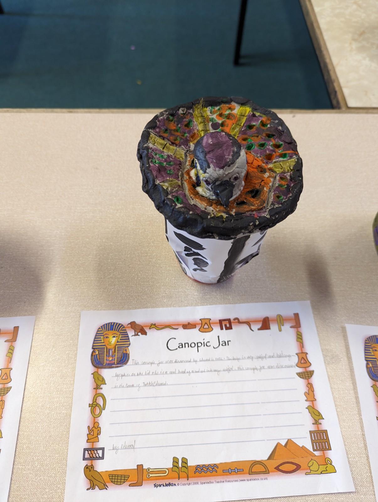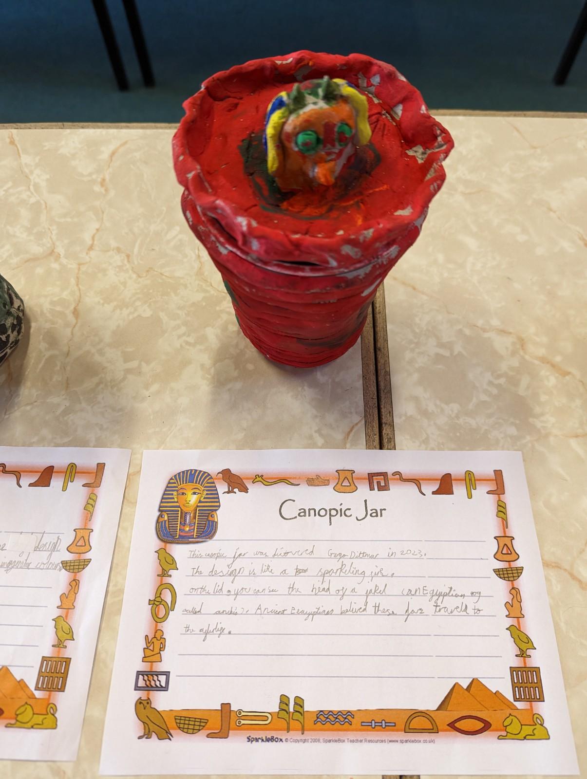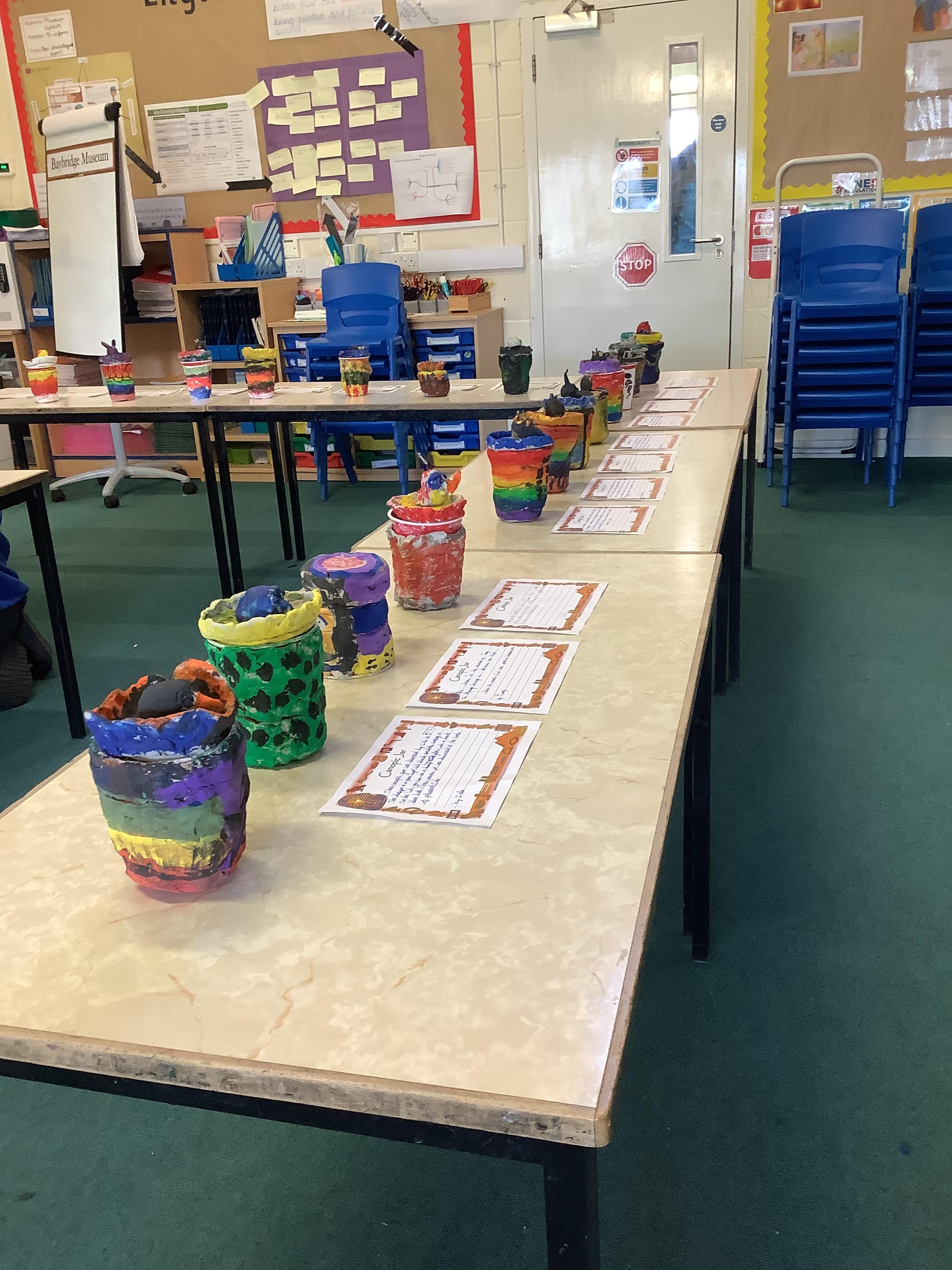 We have worked hard to design, make and decorate our own canopic jars inspired by the Ancient Egyptians. We have included heads of gods on the lid of each jar as well as heiroglyphics for decoration. These will be displayed in our museum.