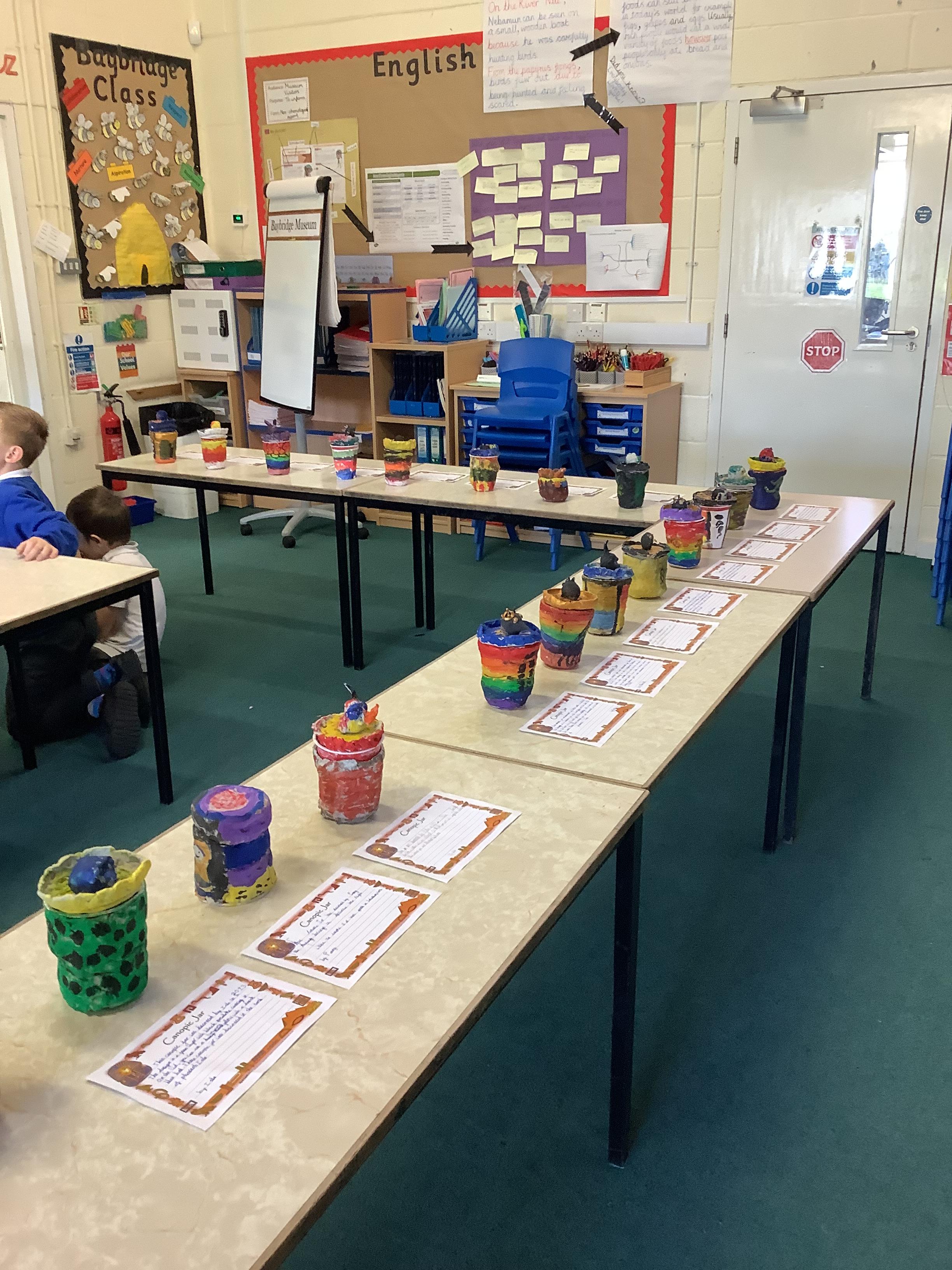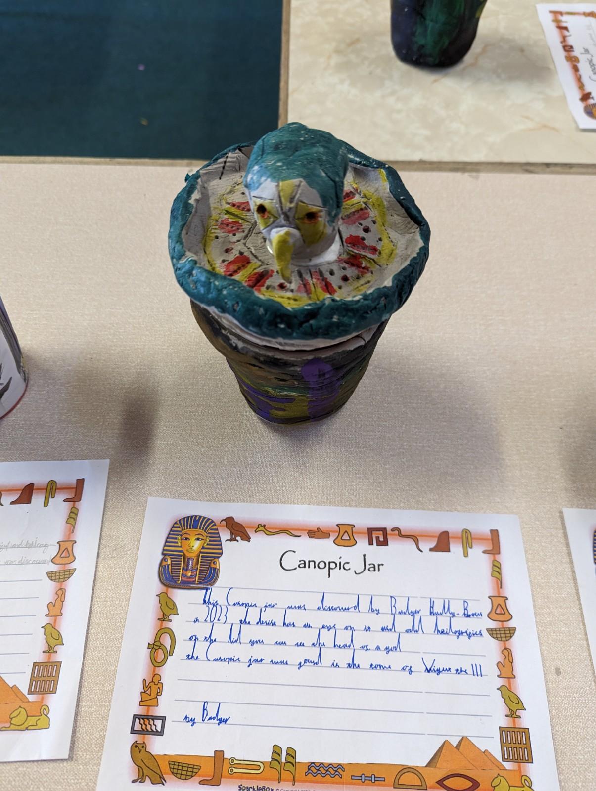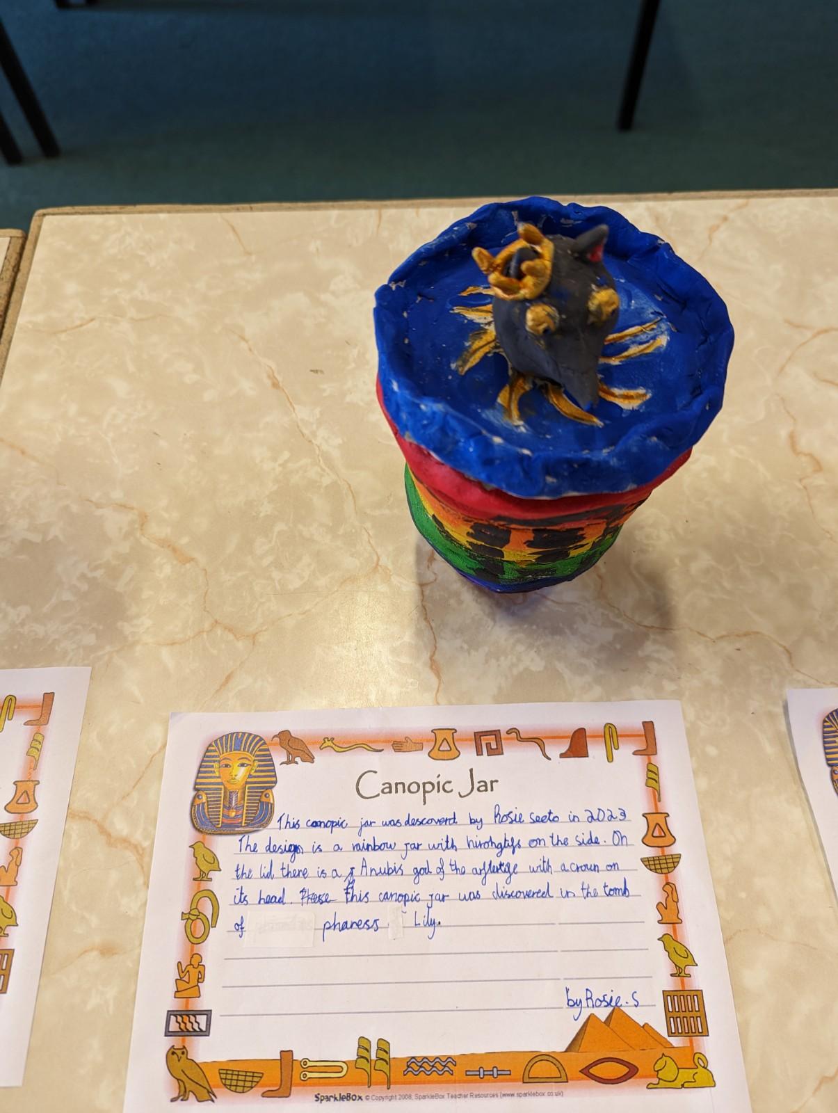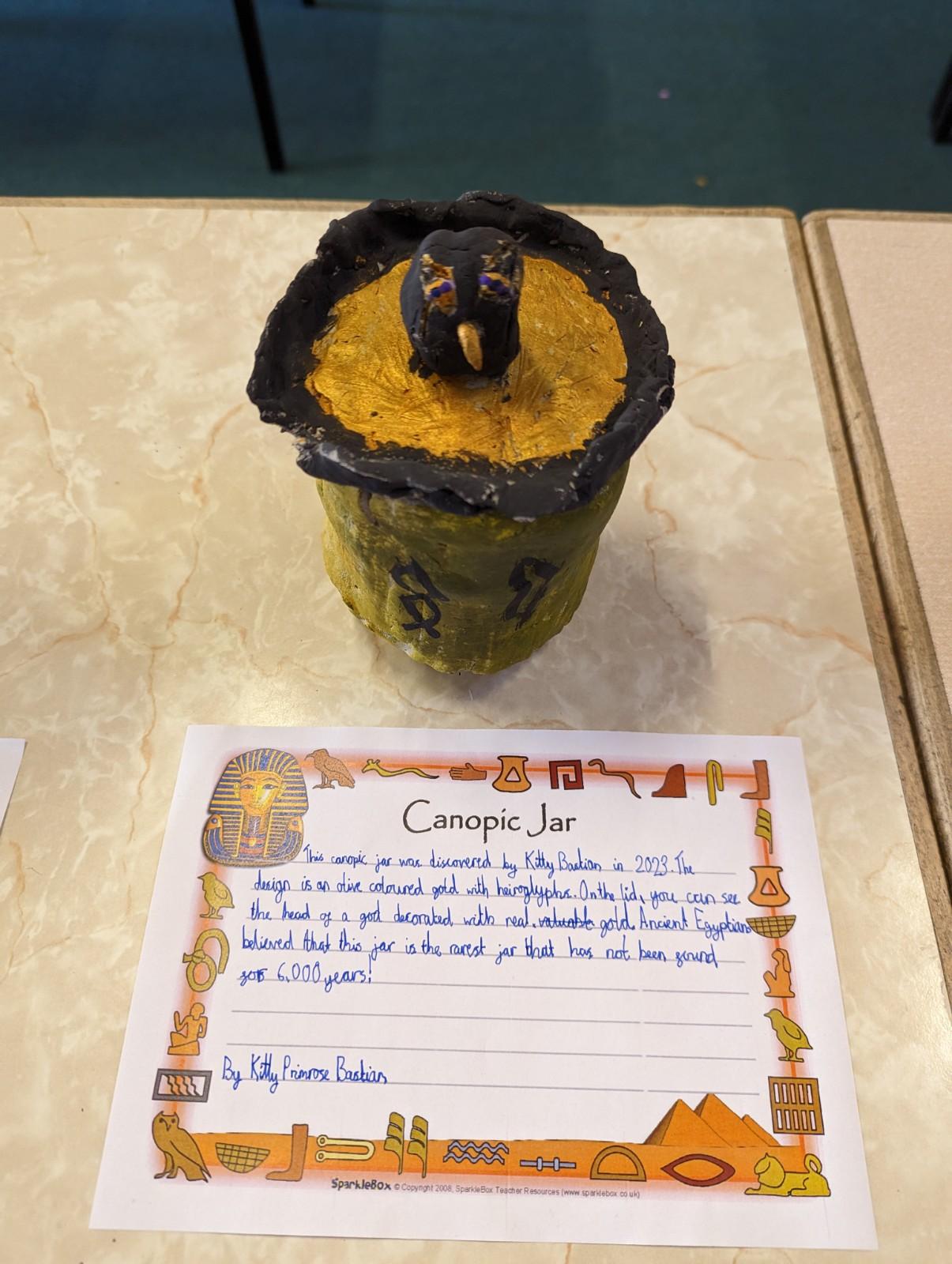We have worked hard to design, make and decorate our own canopic jars inspired by the Ancient Egyptians. We have included heads of gods on the lid of each jar as well as heiroglyphics for decoration. These will be displayed in our museum.