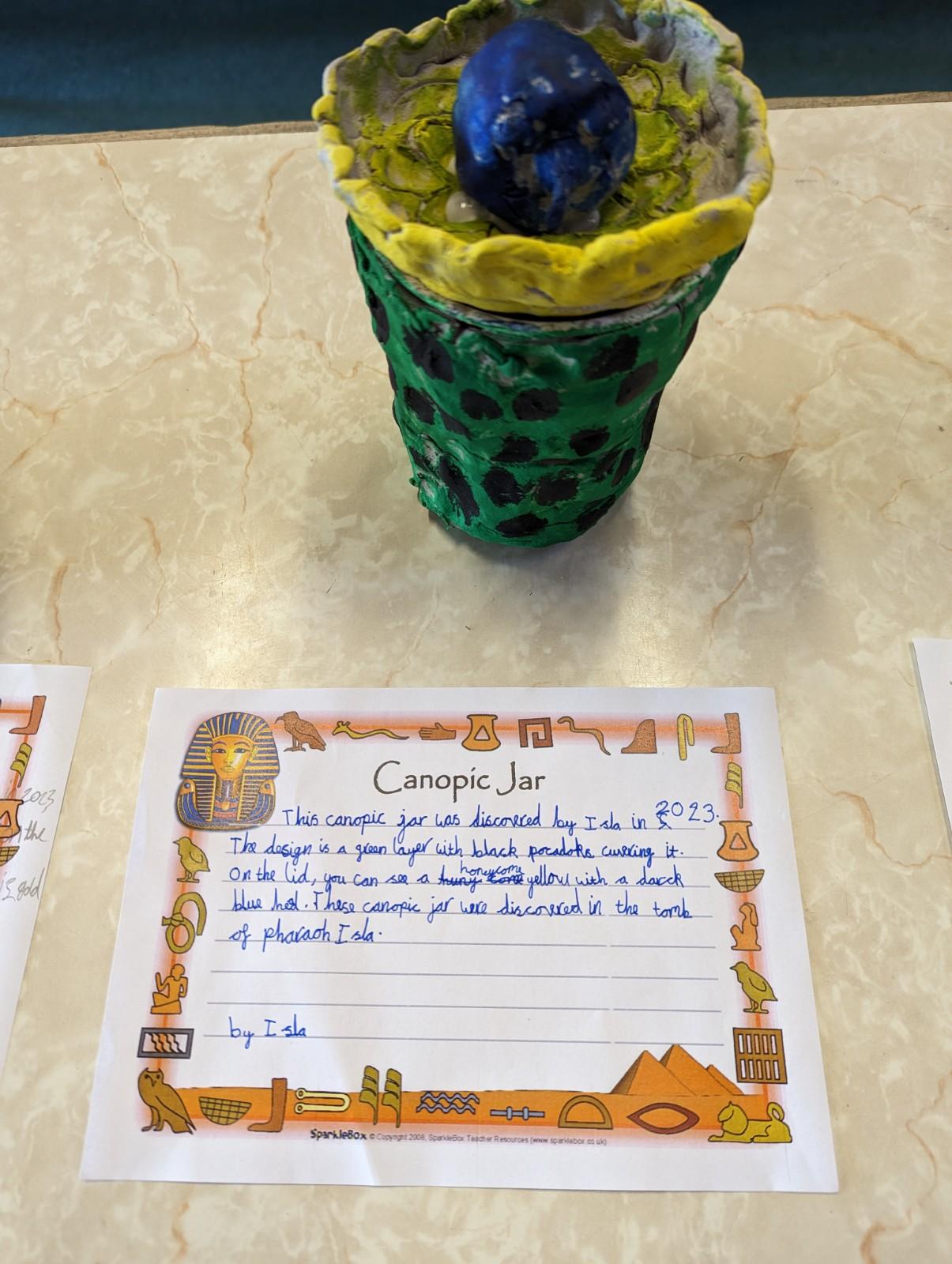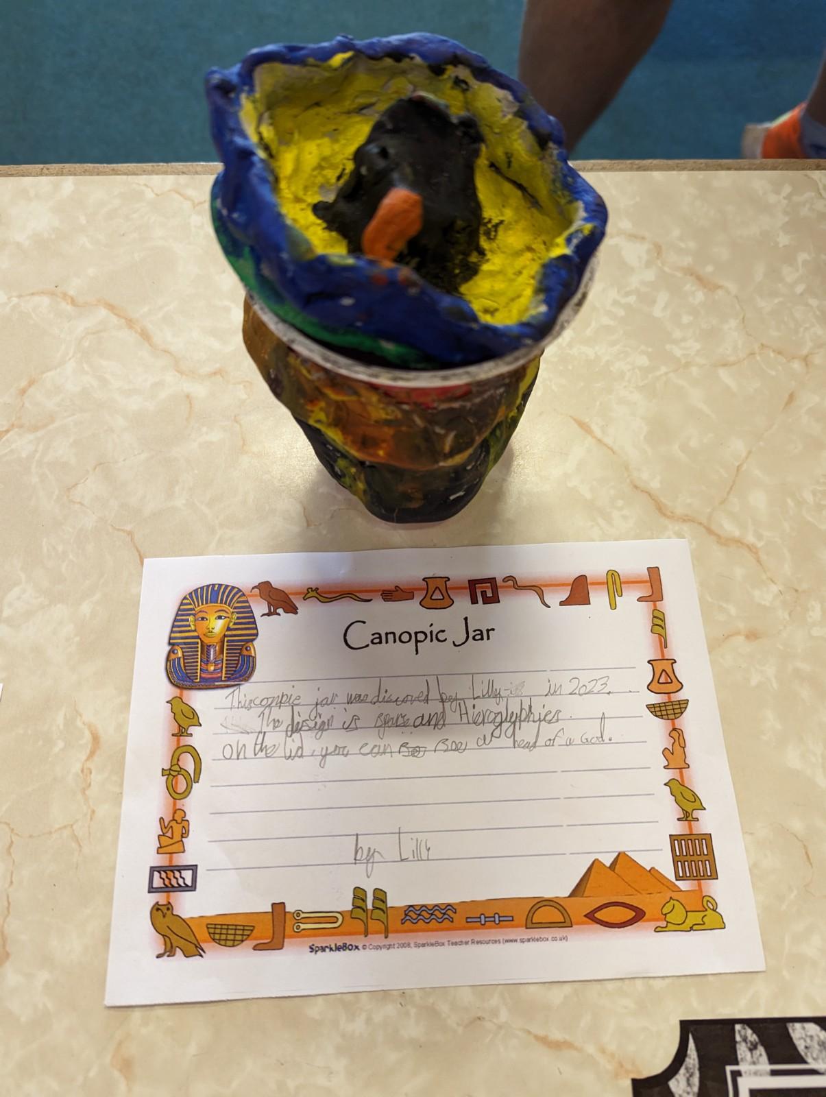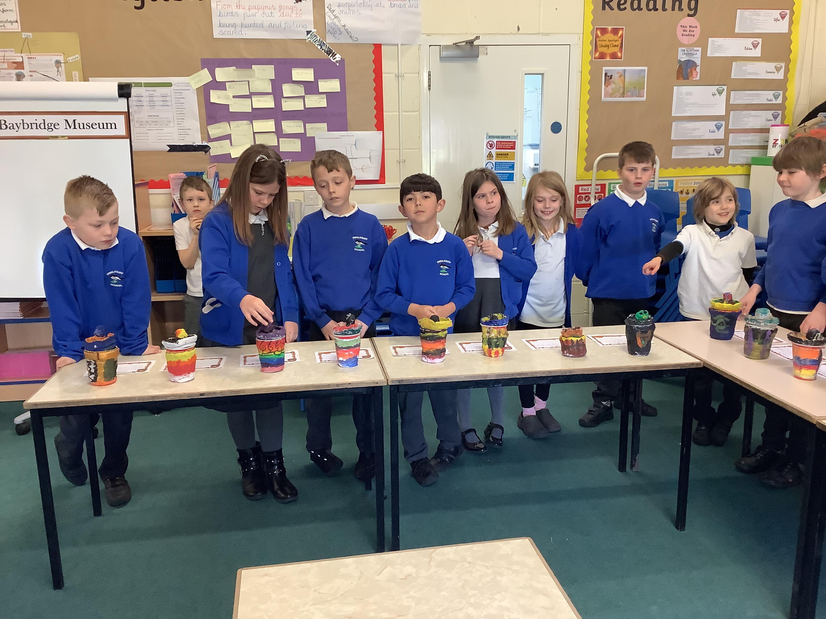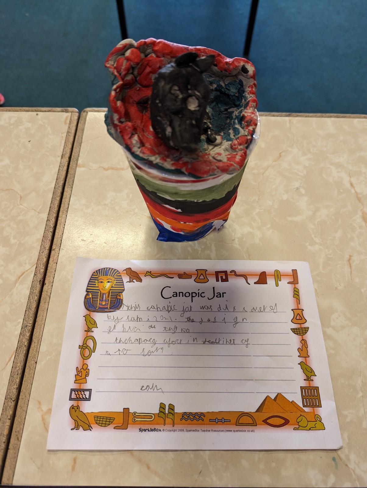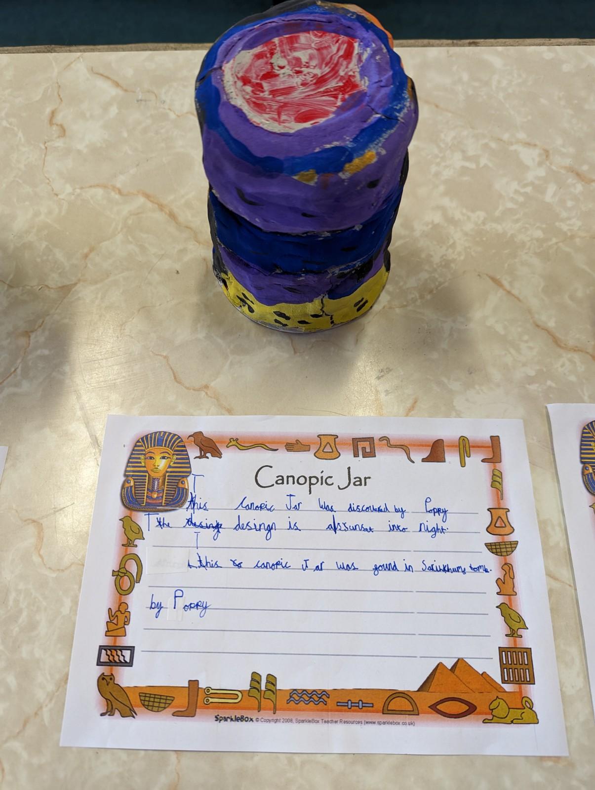 We have worked hard to design, make and decorate our own canopic jars inspired by the Ancient Egyptians. We have included heads of gods on the lid of each jar as well as heiroglyphics for decoration. These will be displayed in our museum.