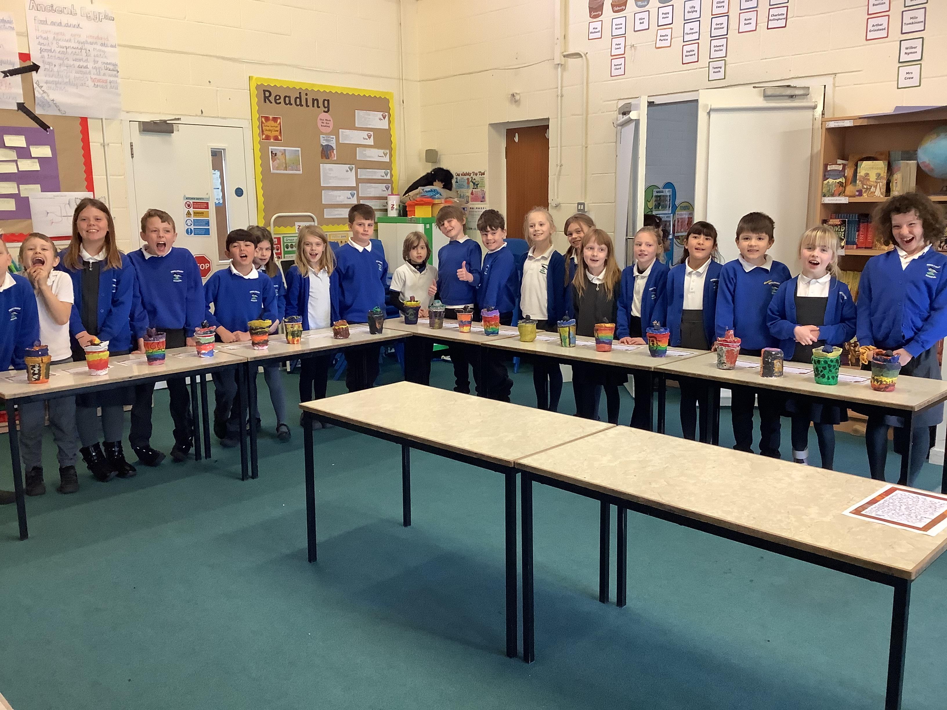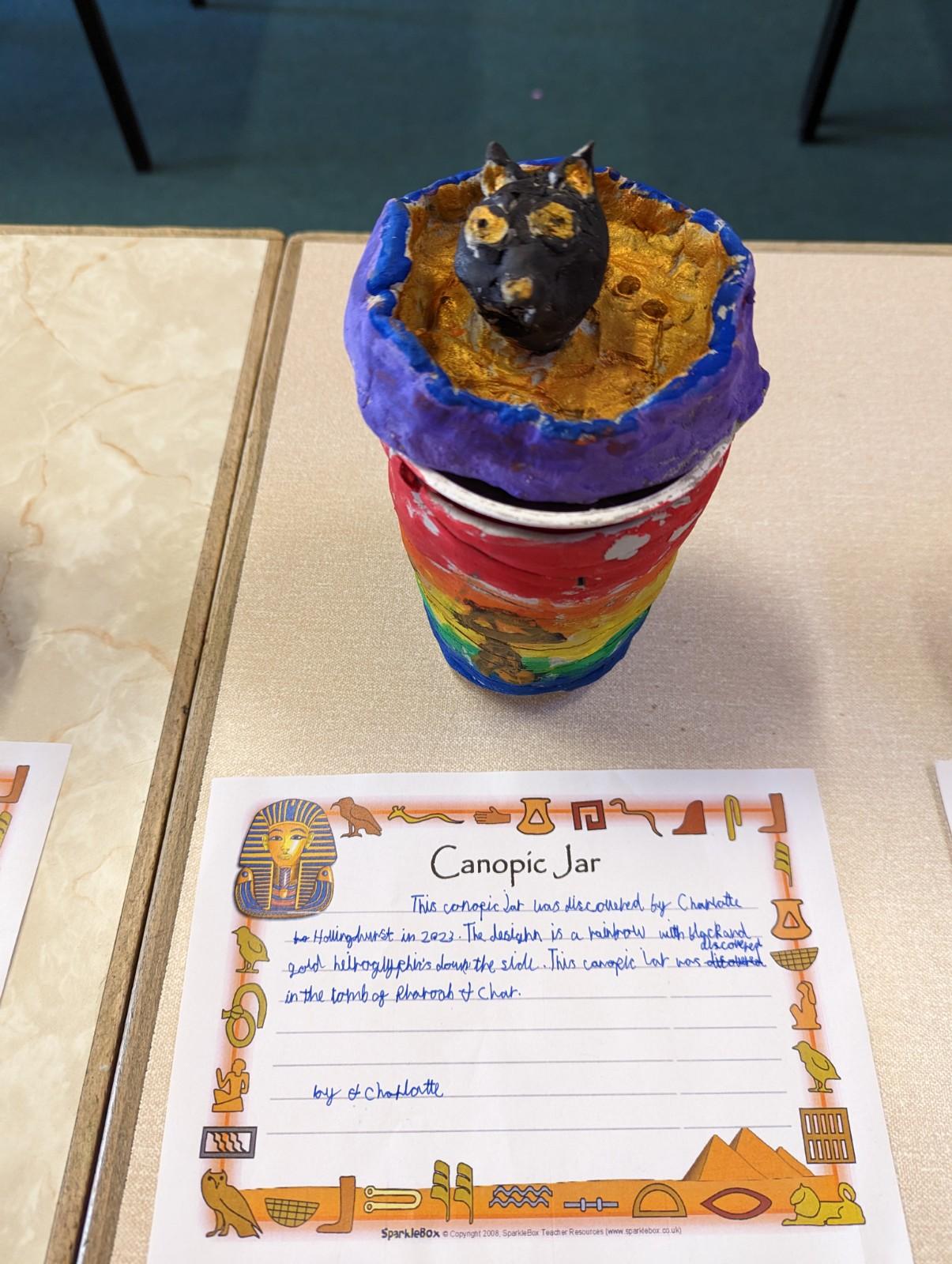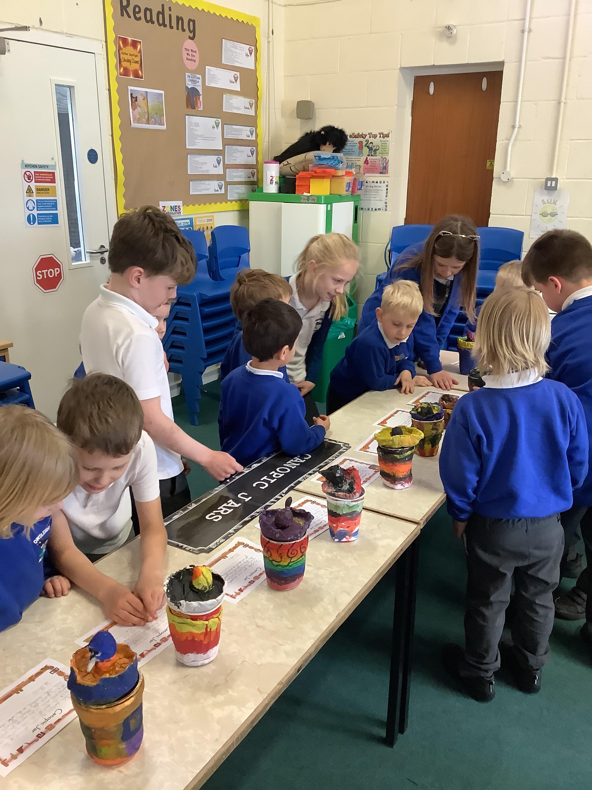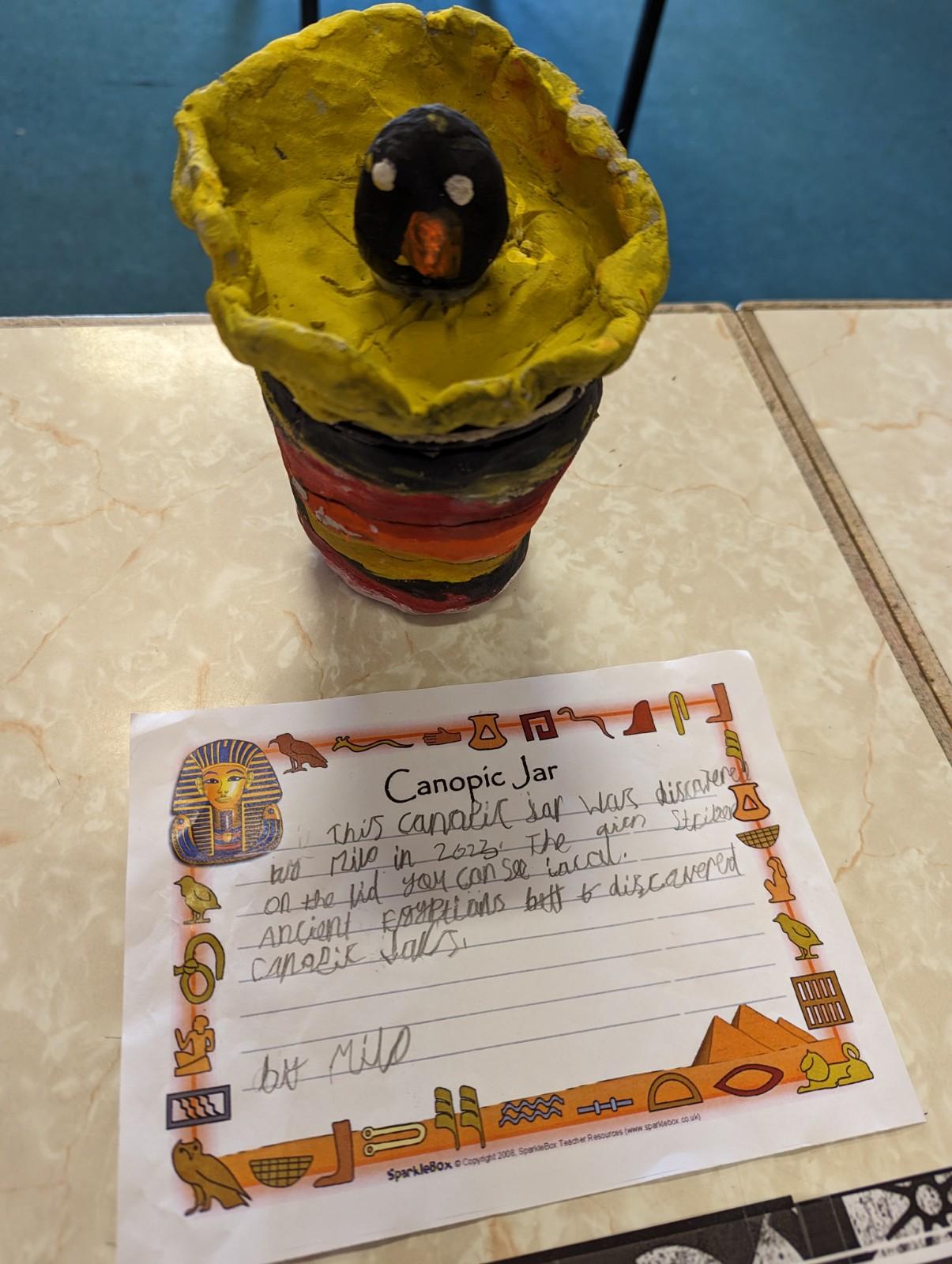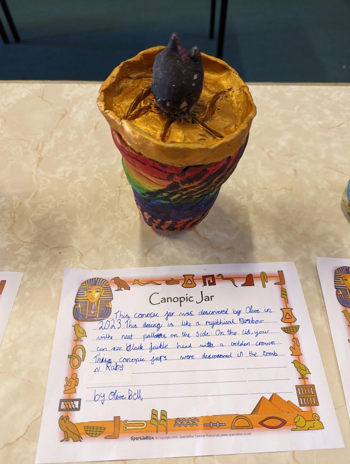 We have worked hard to design, make and decorate our own canopic jars inspired by the Ancient Egyptians. We have included heads of gods on the lid of each jar as well as heiroglyphics for decoration. These will be displayed in our museum.