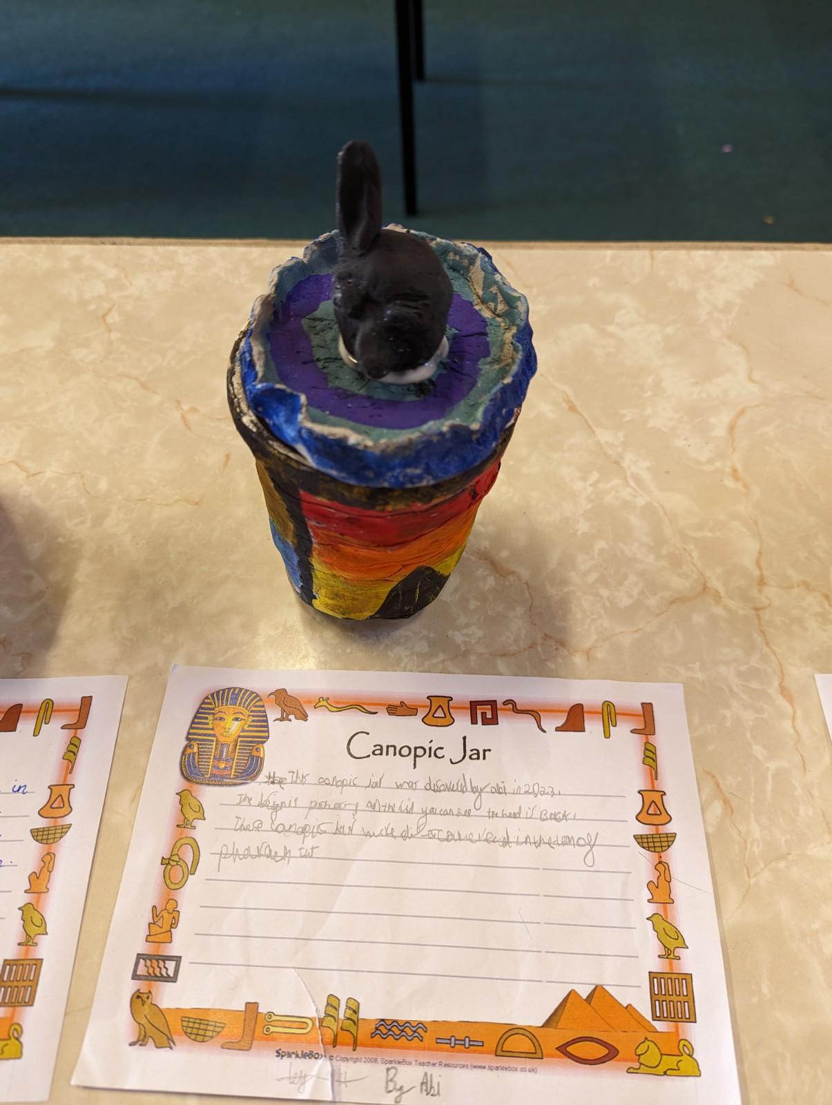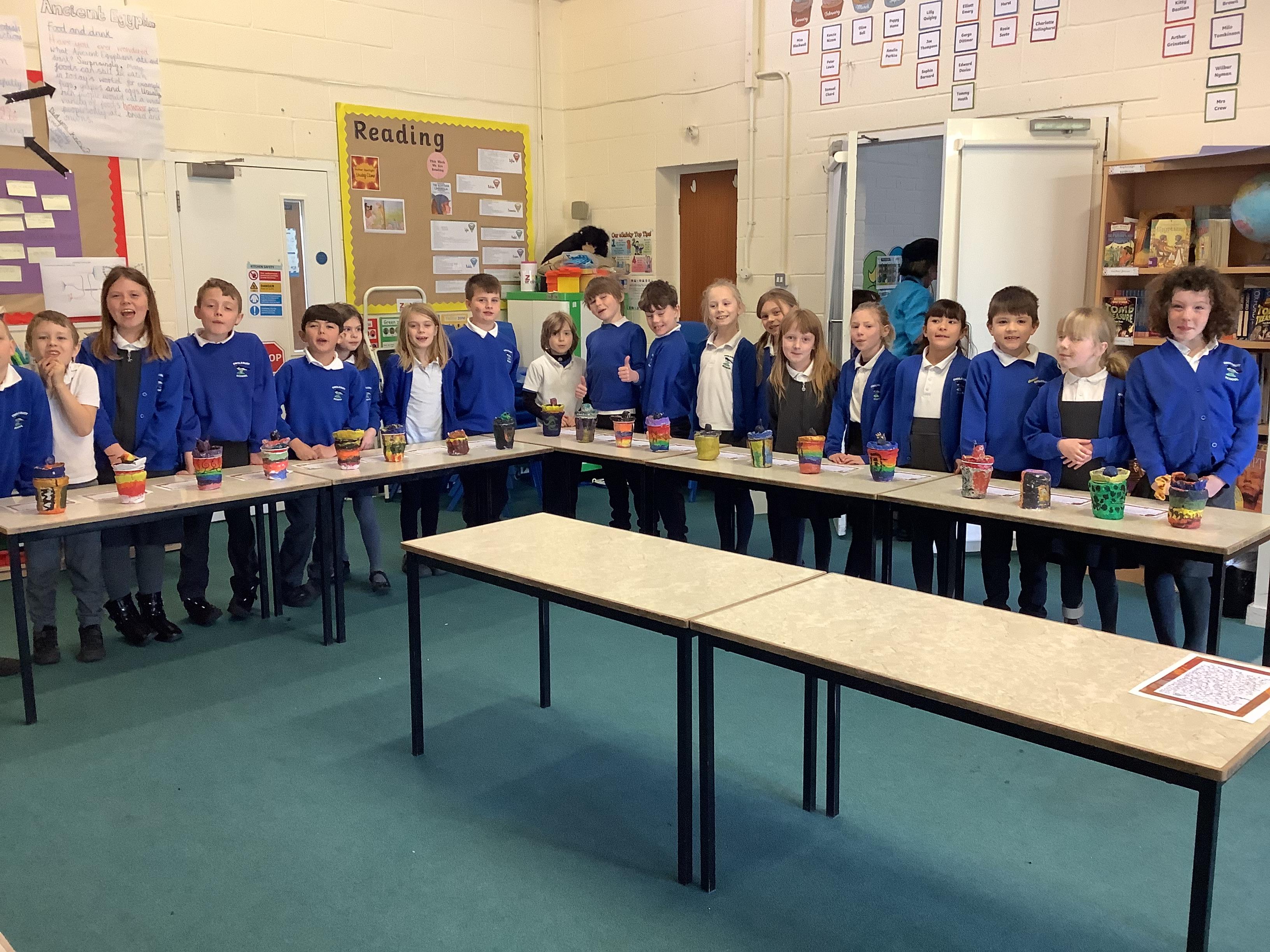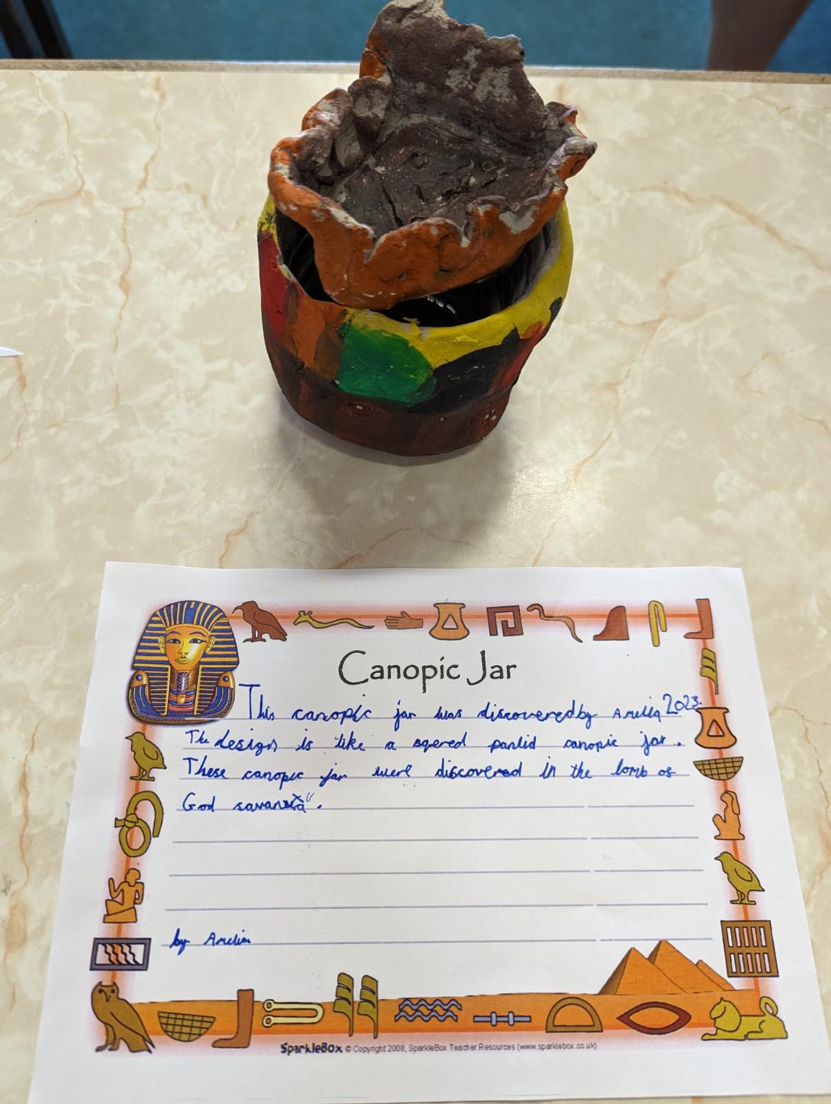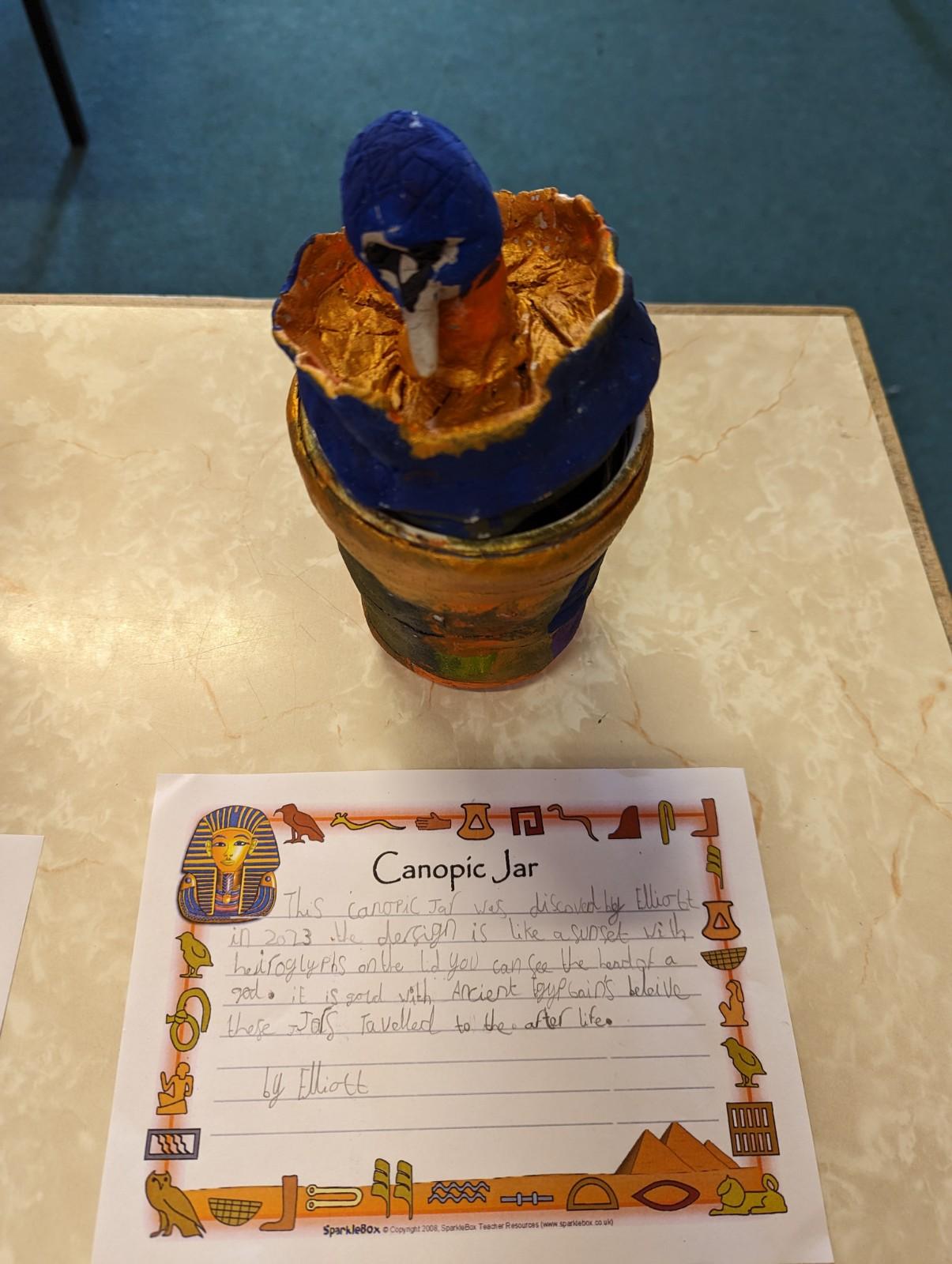 We have worked hard to design, make and decorate our own canopic jars inspired by the Ancient Egyptians. We have included heads of gods on the lid of each jar as well as heiroglyphics for decoration. These will be displayed in our museum.