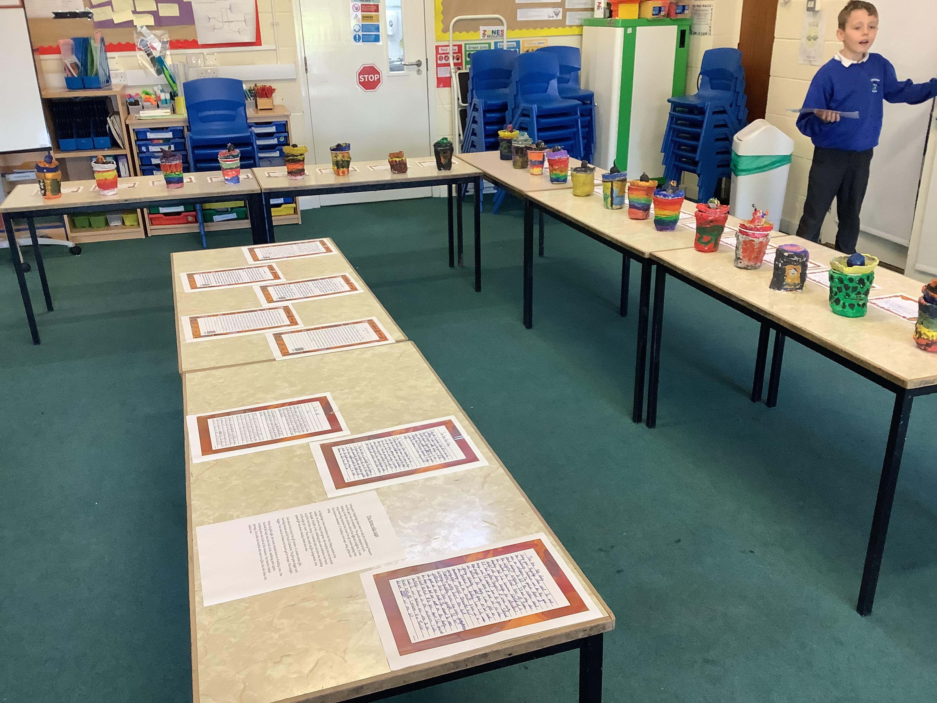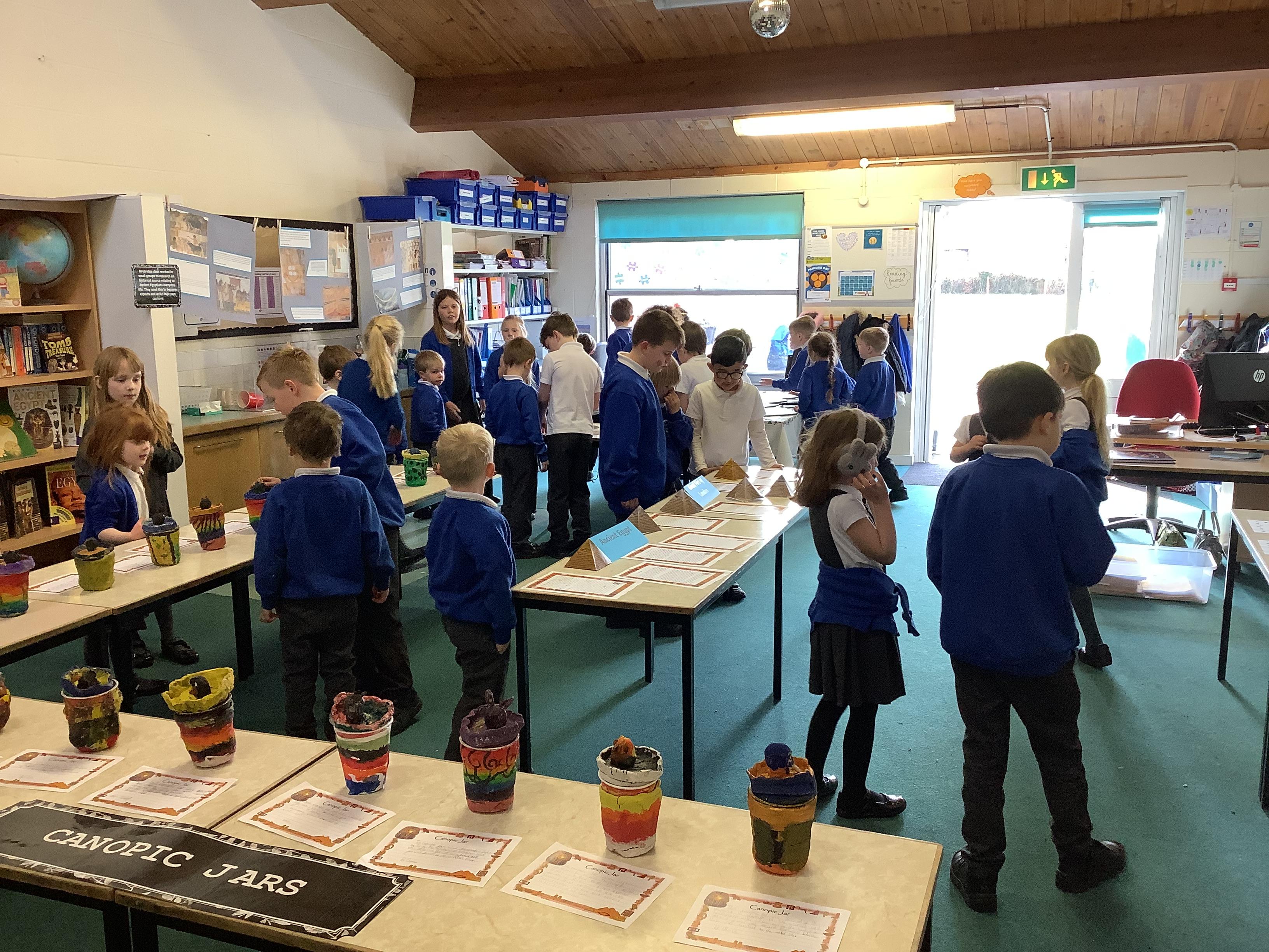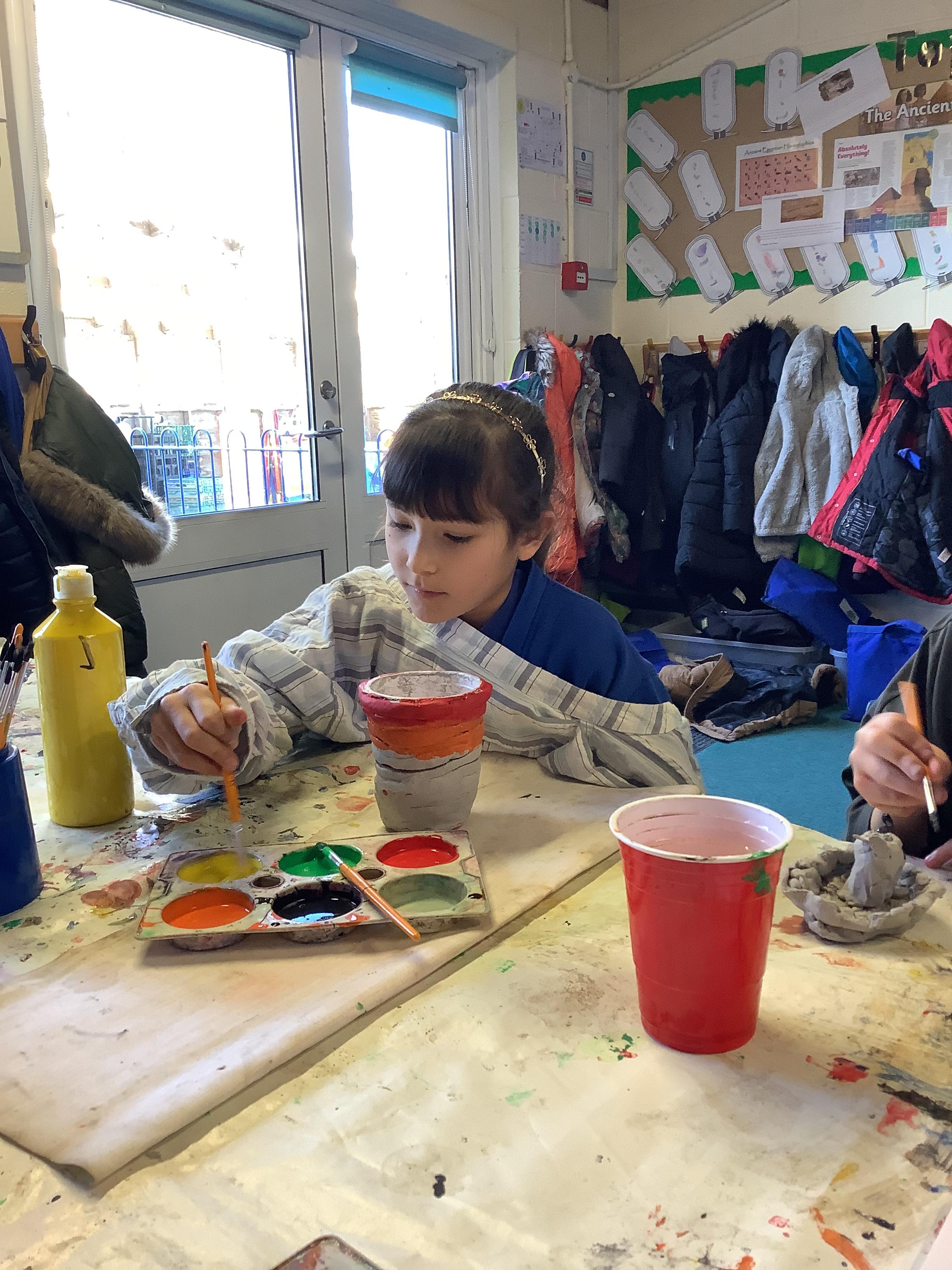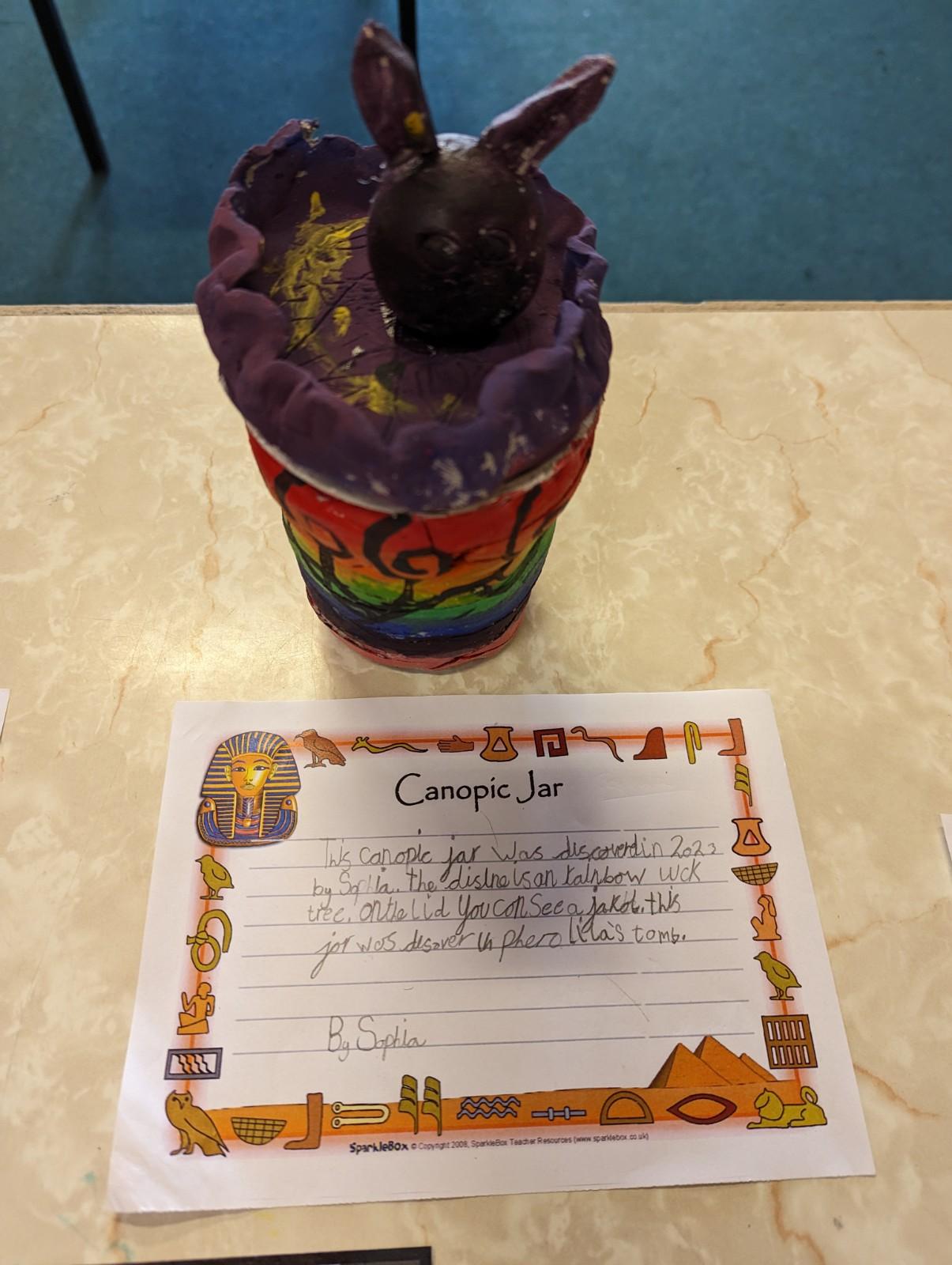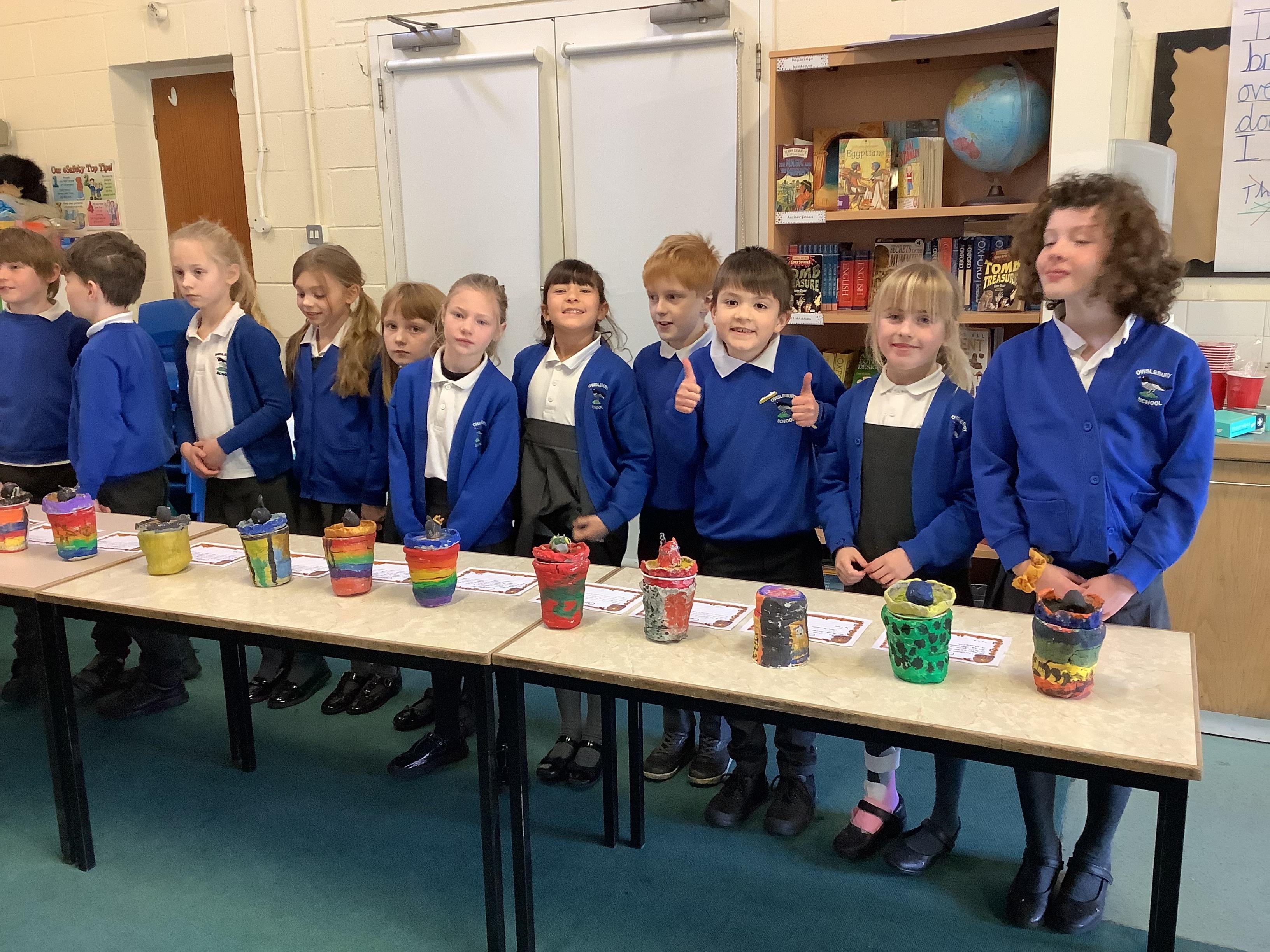 We have worked hard to design, make and decorate our own canopic jars inspired by the Ancient Egyptians. We have included heads of gods on the lid of each jar as well as heiroglyphics for decoration. These will be displayed in our museum.