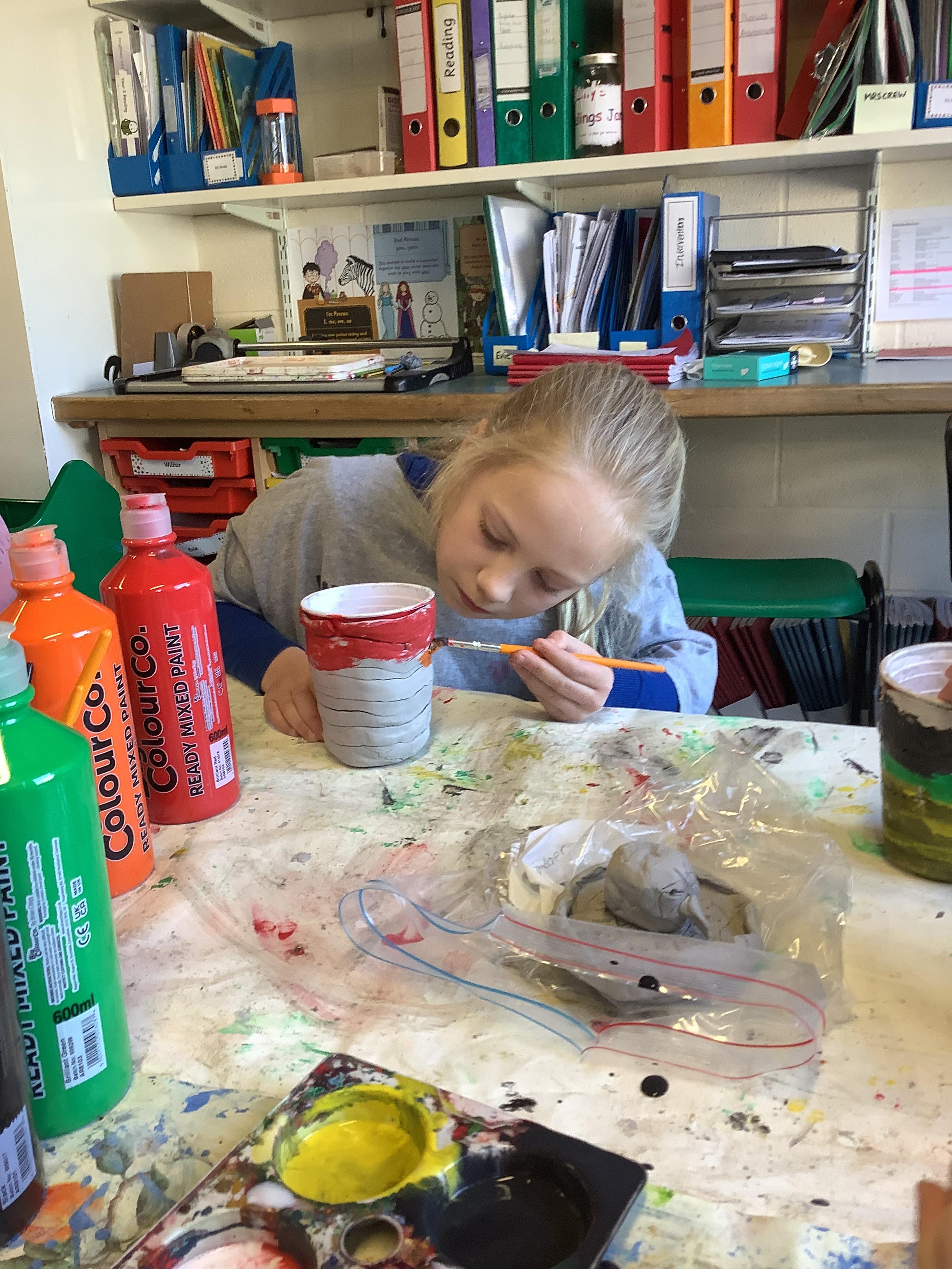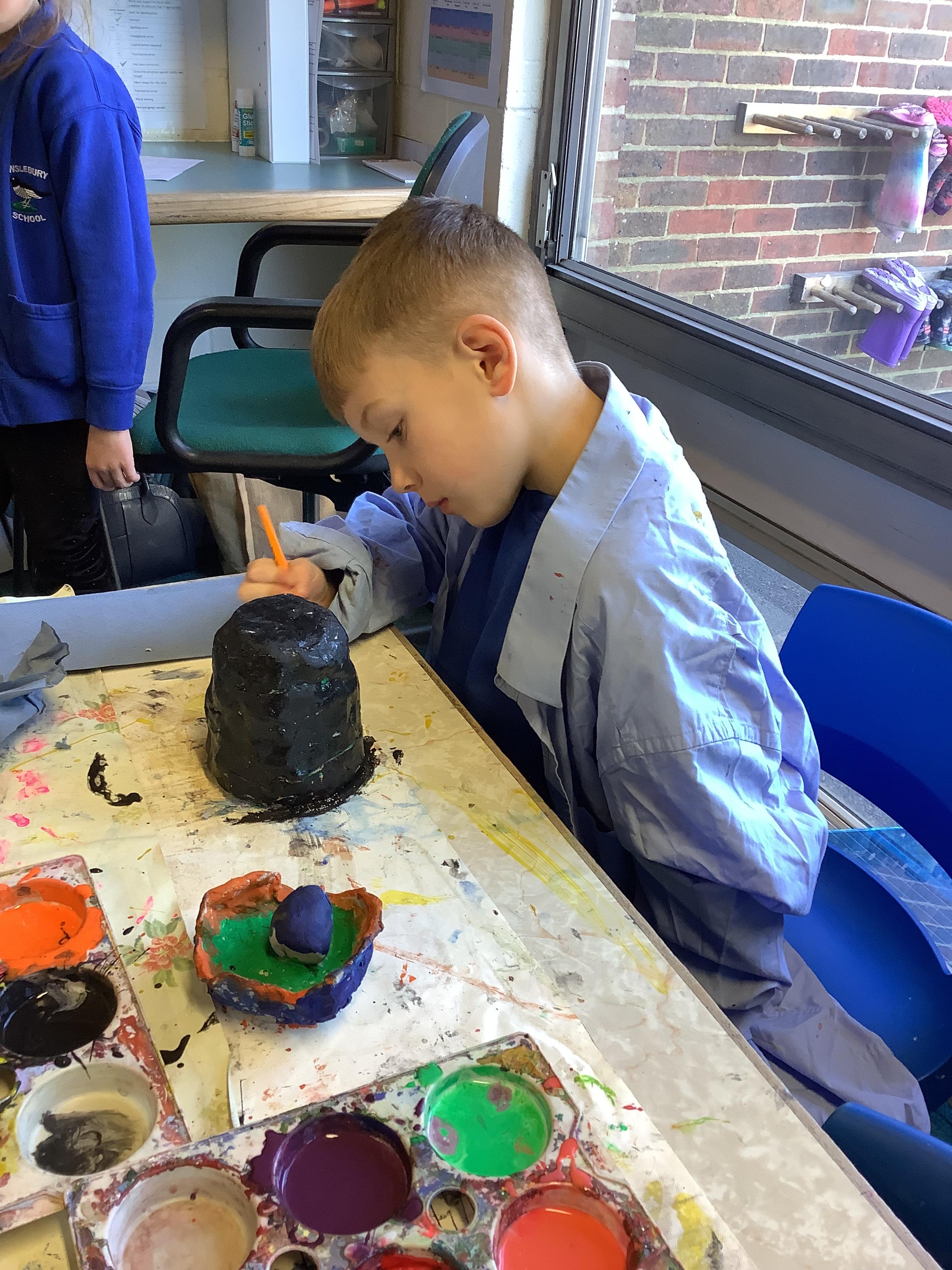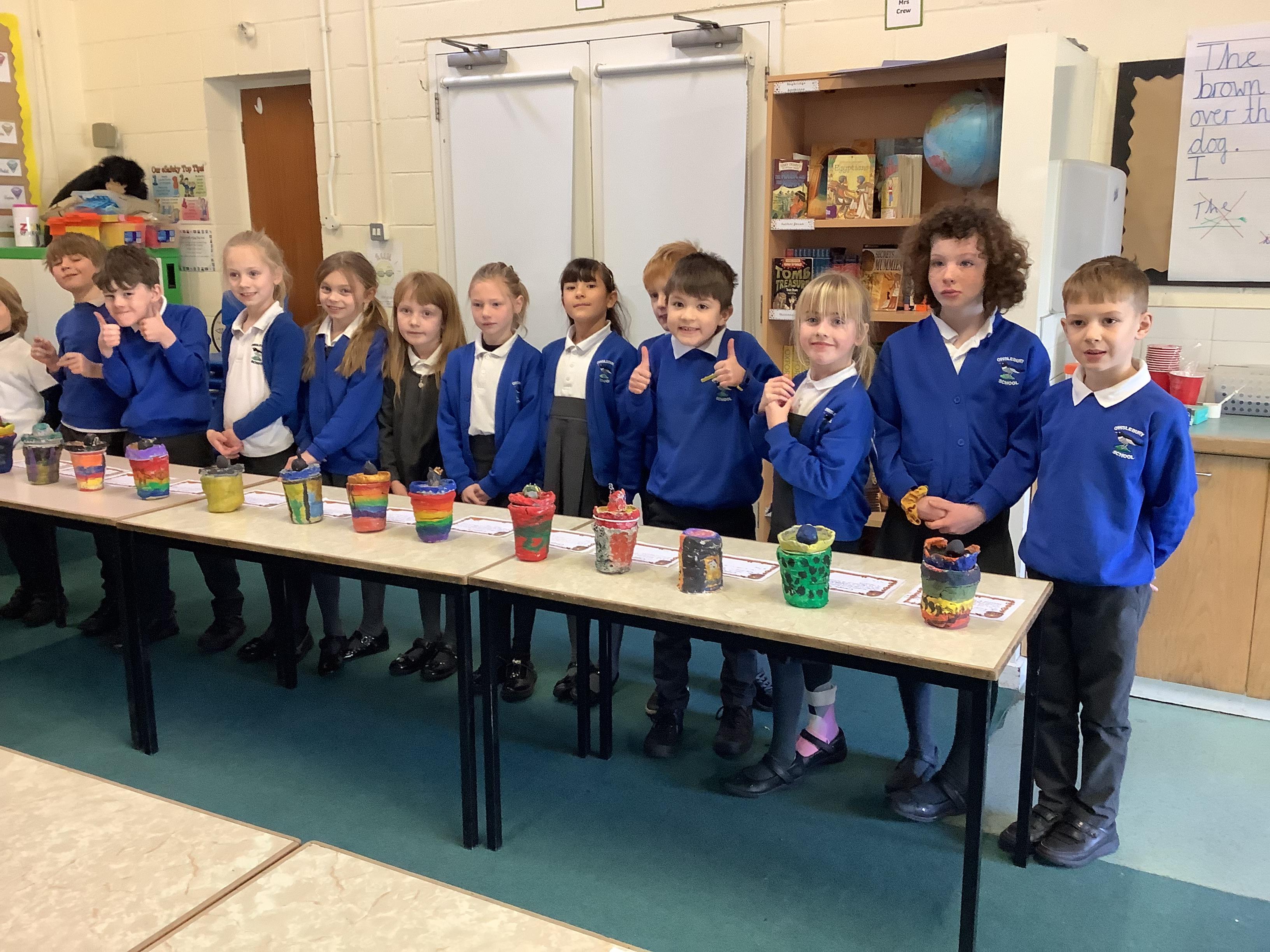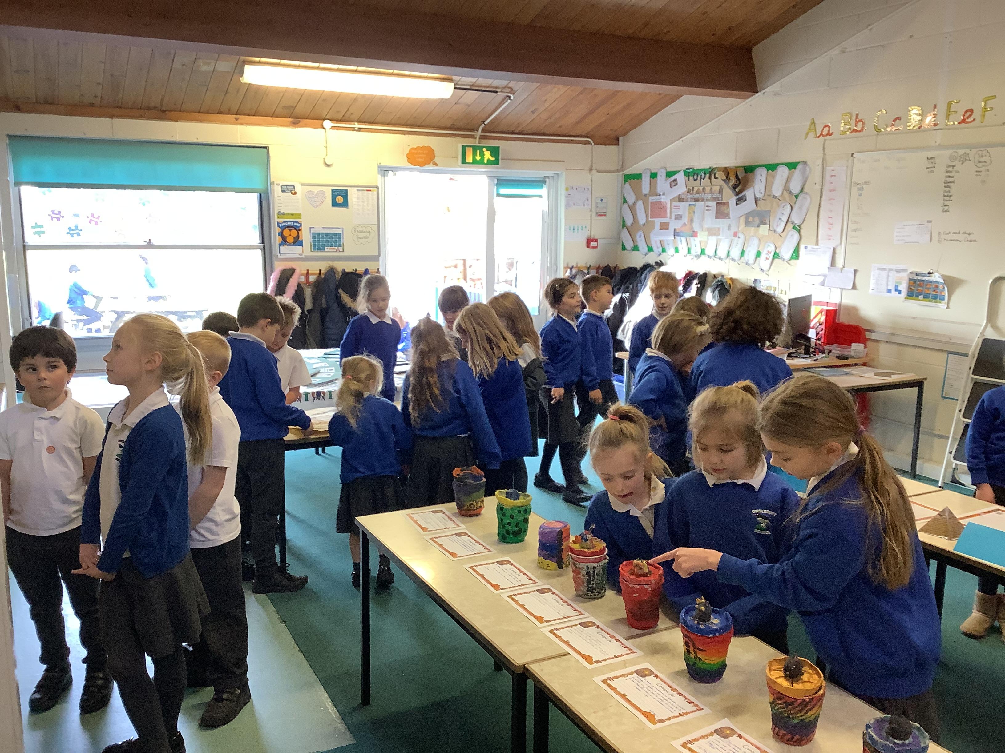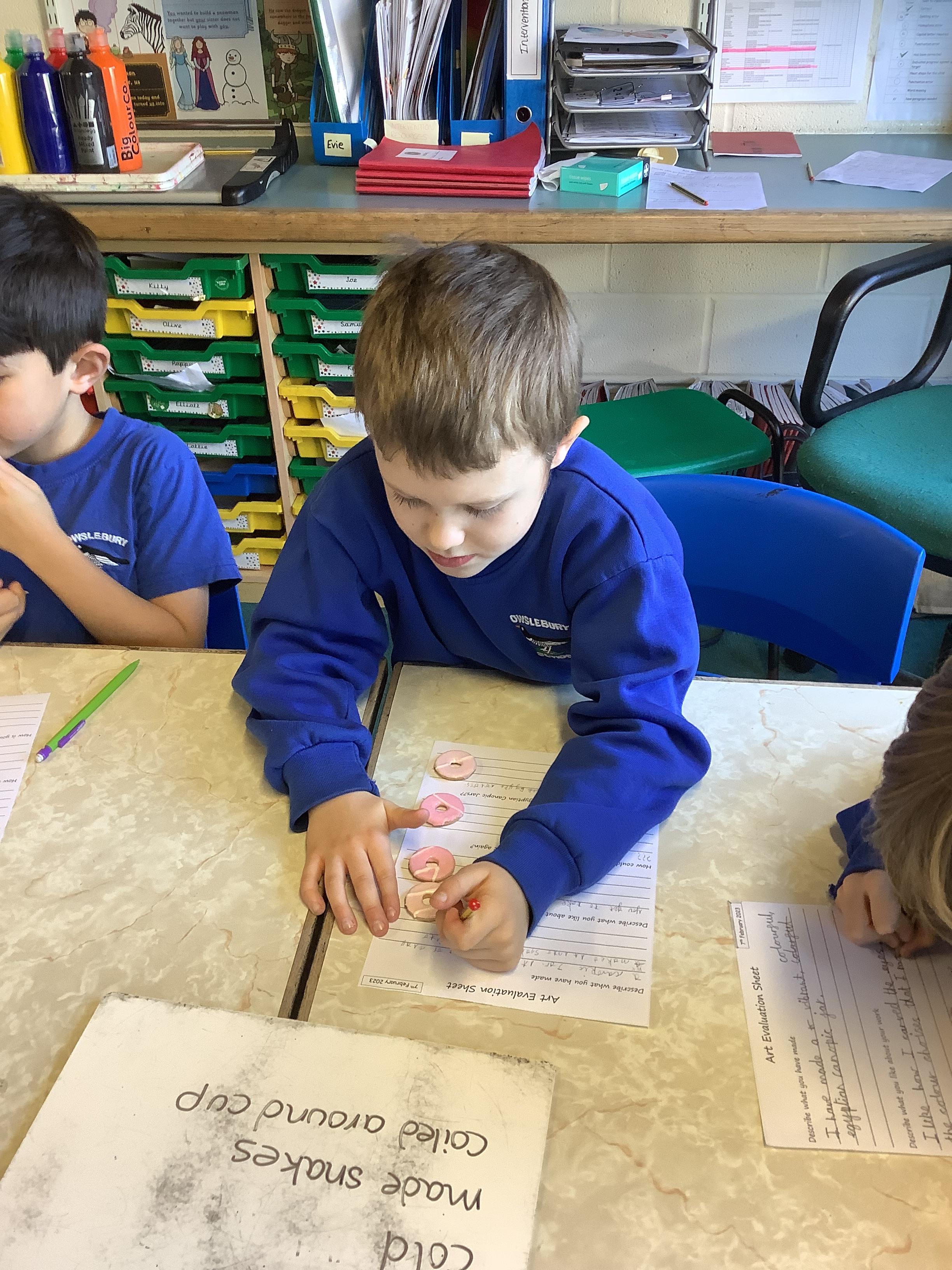 We have worked hard to design, make and decorate our own canopic jars inspired by the Ancient Egyptians. We have included heads of gods on the lid of each jar as well as heiroglyphics for decoration. These will be displayed in our museum.