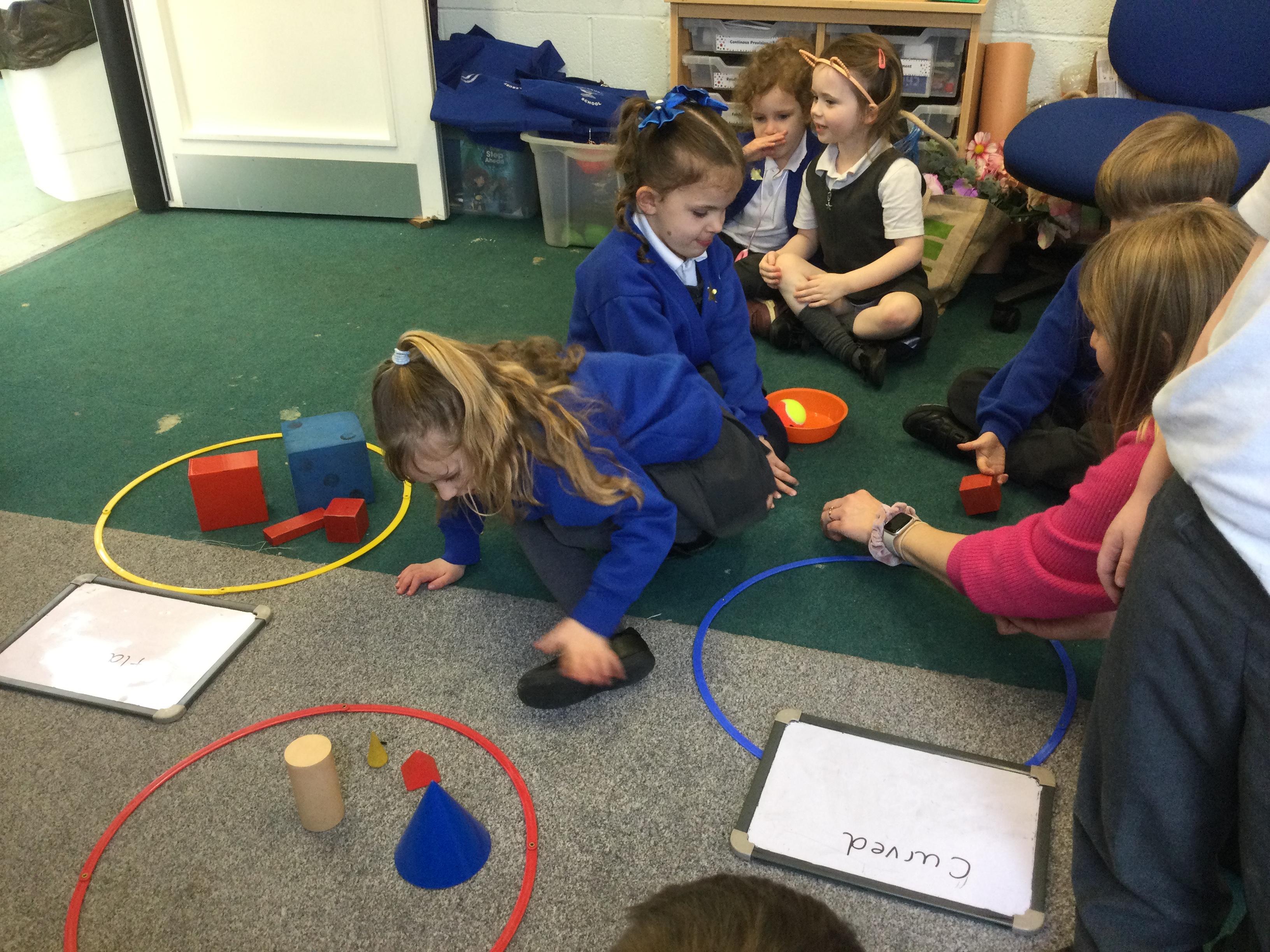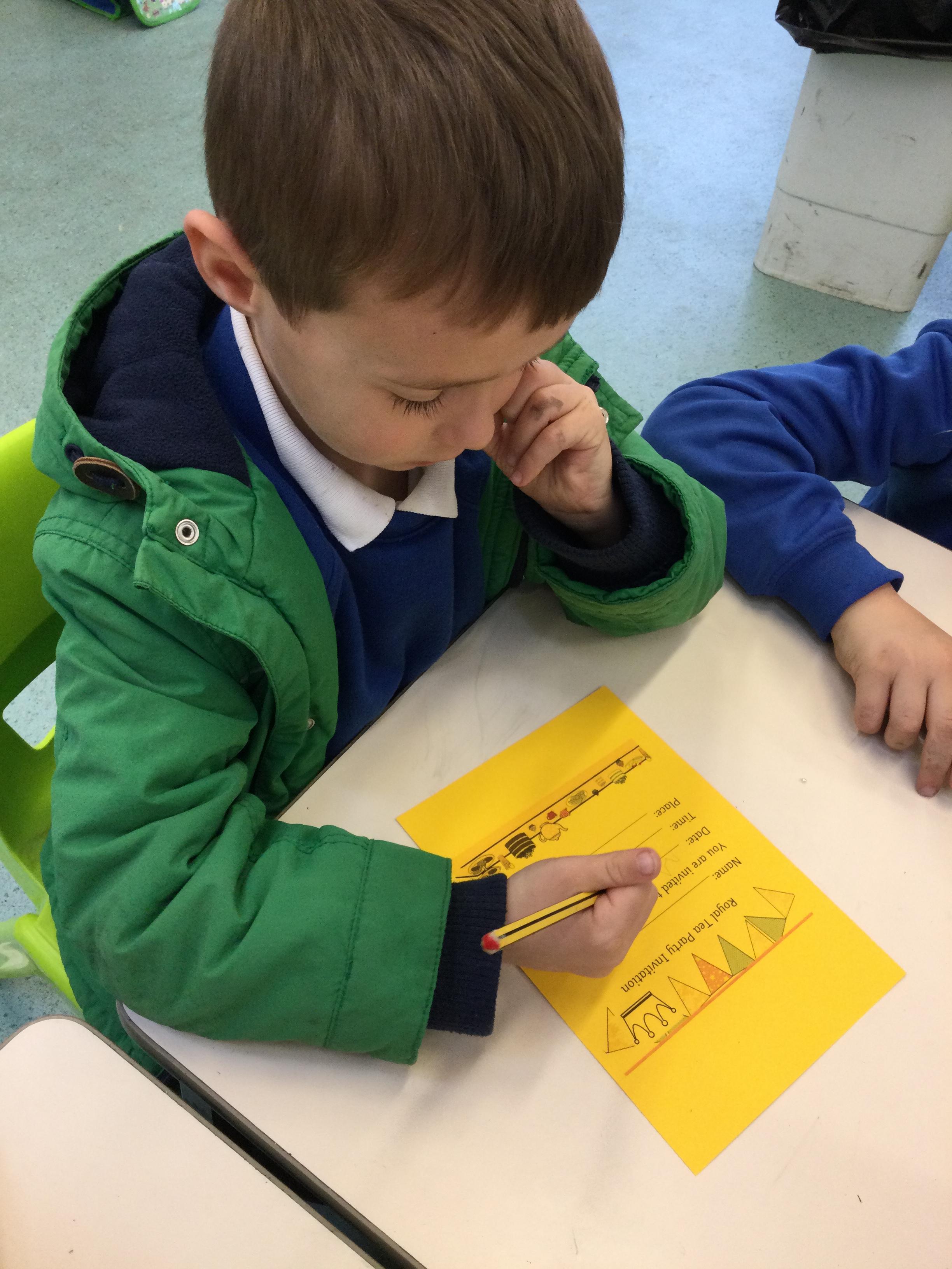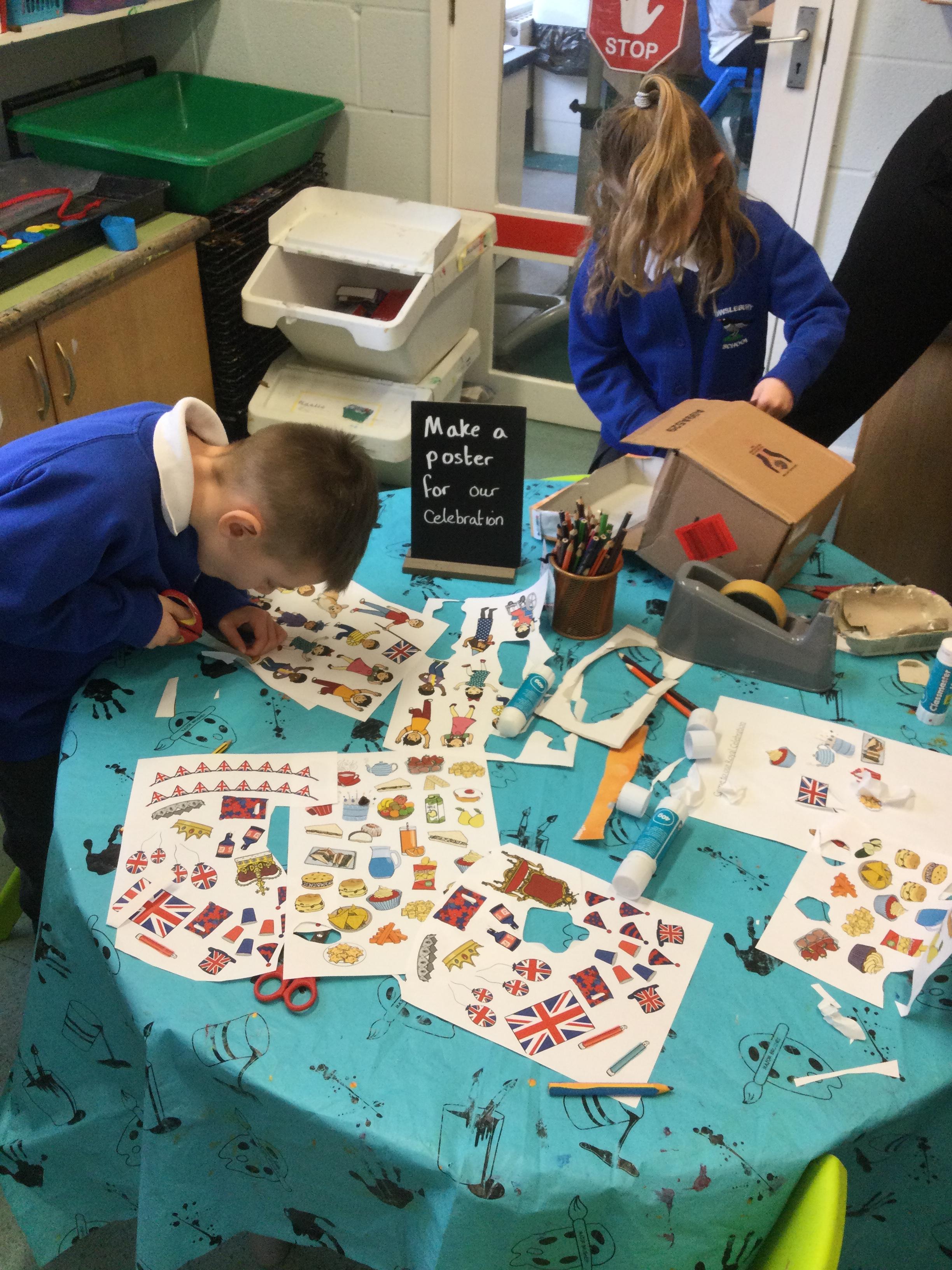 We made posters for our Royal Celebration party and wrote the ingredients needed to make scones on the writing table. In maths we used our weighing skills to measure out the ingredients carefully and we have also been learning the names and properties of 3D shapes.