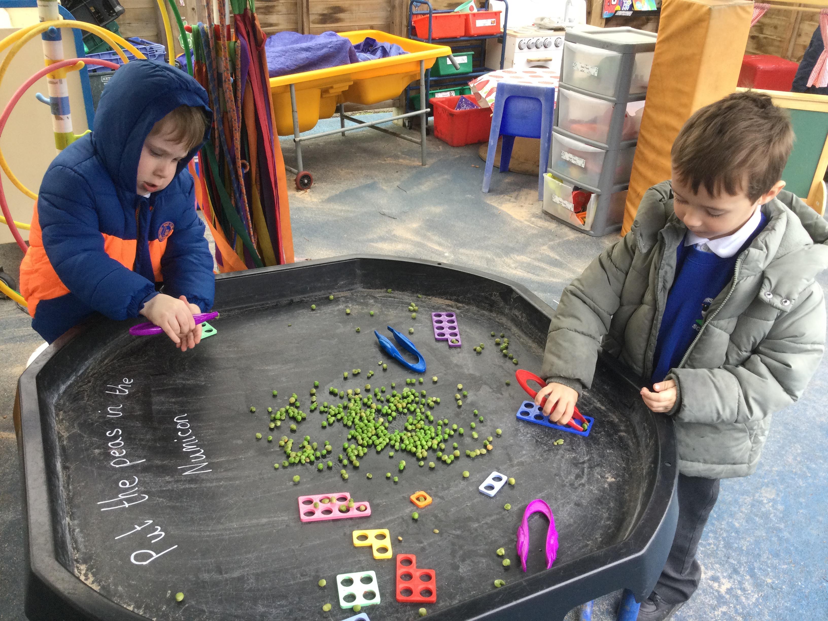 In Discovery Time we have been picking up peas with tweezers and placing them in Numicon, making and decorating crowns and dressing up in royal clothing.