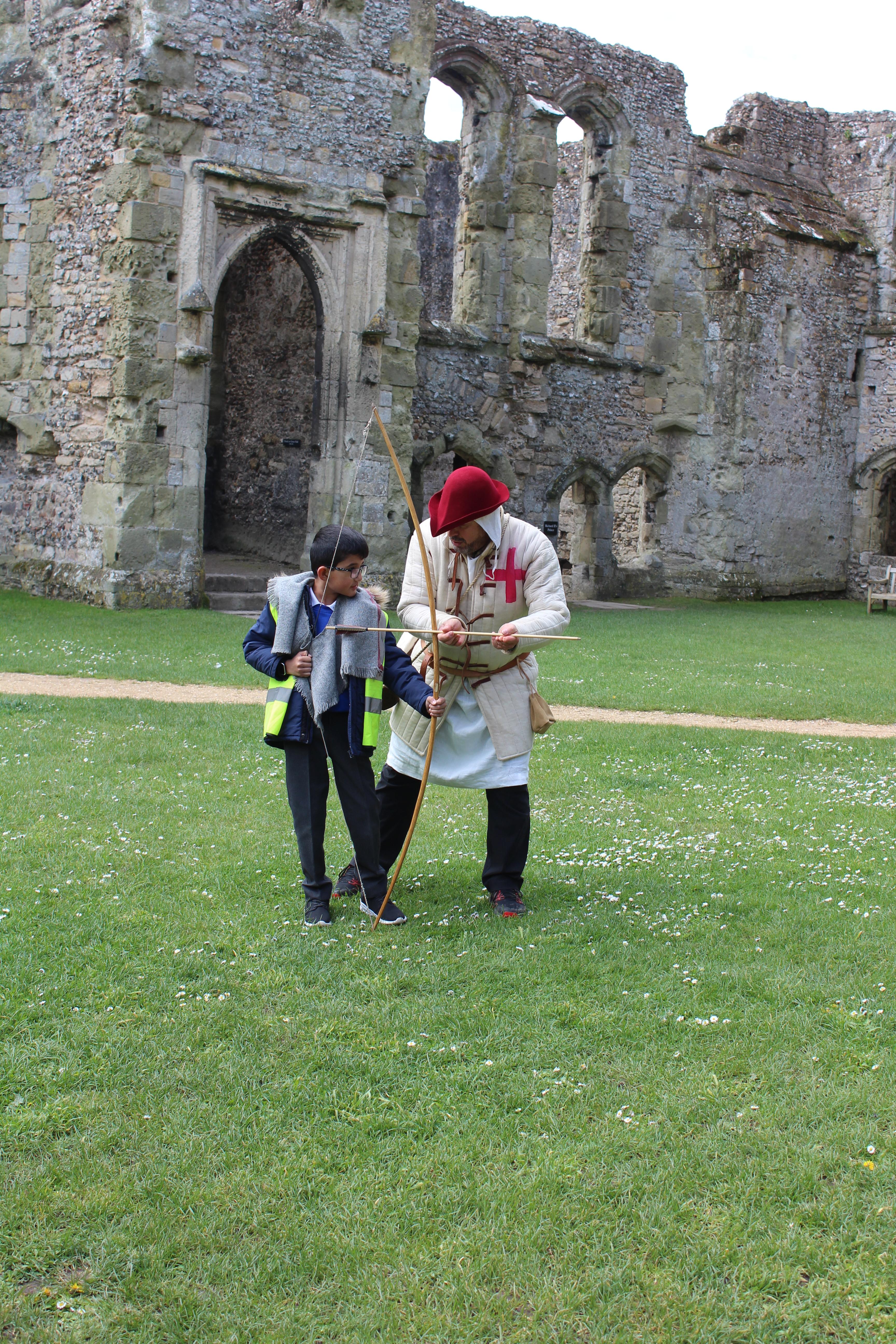 We began our visit with a workshop led by the staff at Porchester Castle. They took us around the castle grounds and told us all about what life was like when the Kings and Queens lived there. Some of us were even able to dress up as royalty or guards...and the rest had to be their servants! Cameron was in charge of defending the castle, acting as the archer. He had the difficult job of pulling back the string on the long bow, which was pretty tricky. Did you know that boys used to start learning to use the long bow when they were only 8?