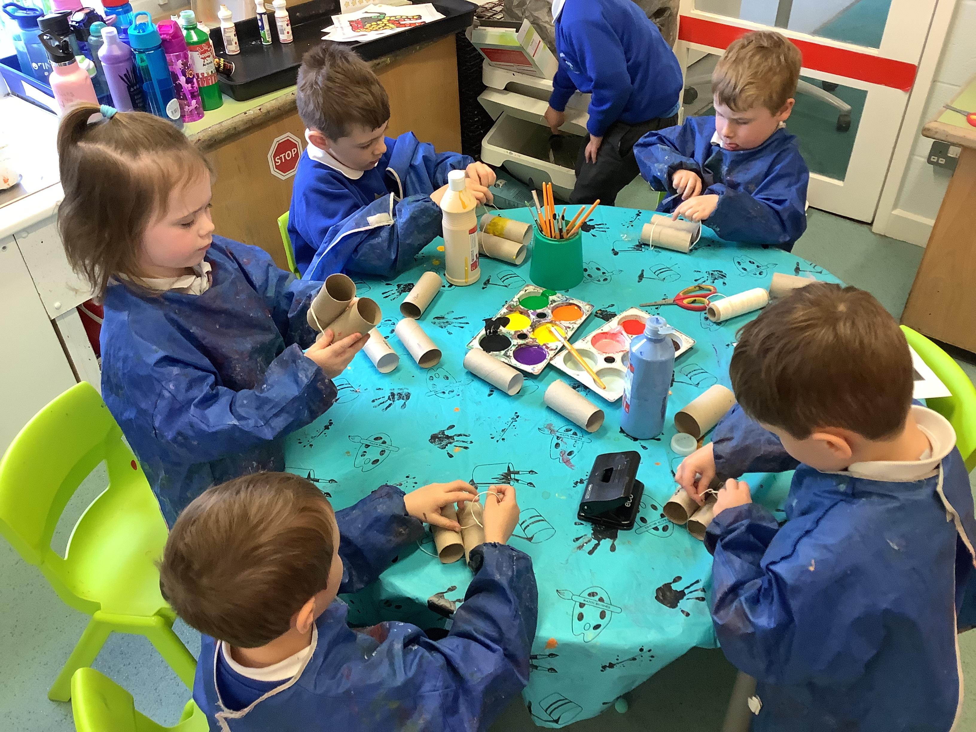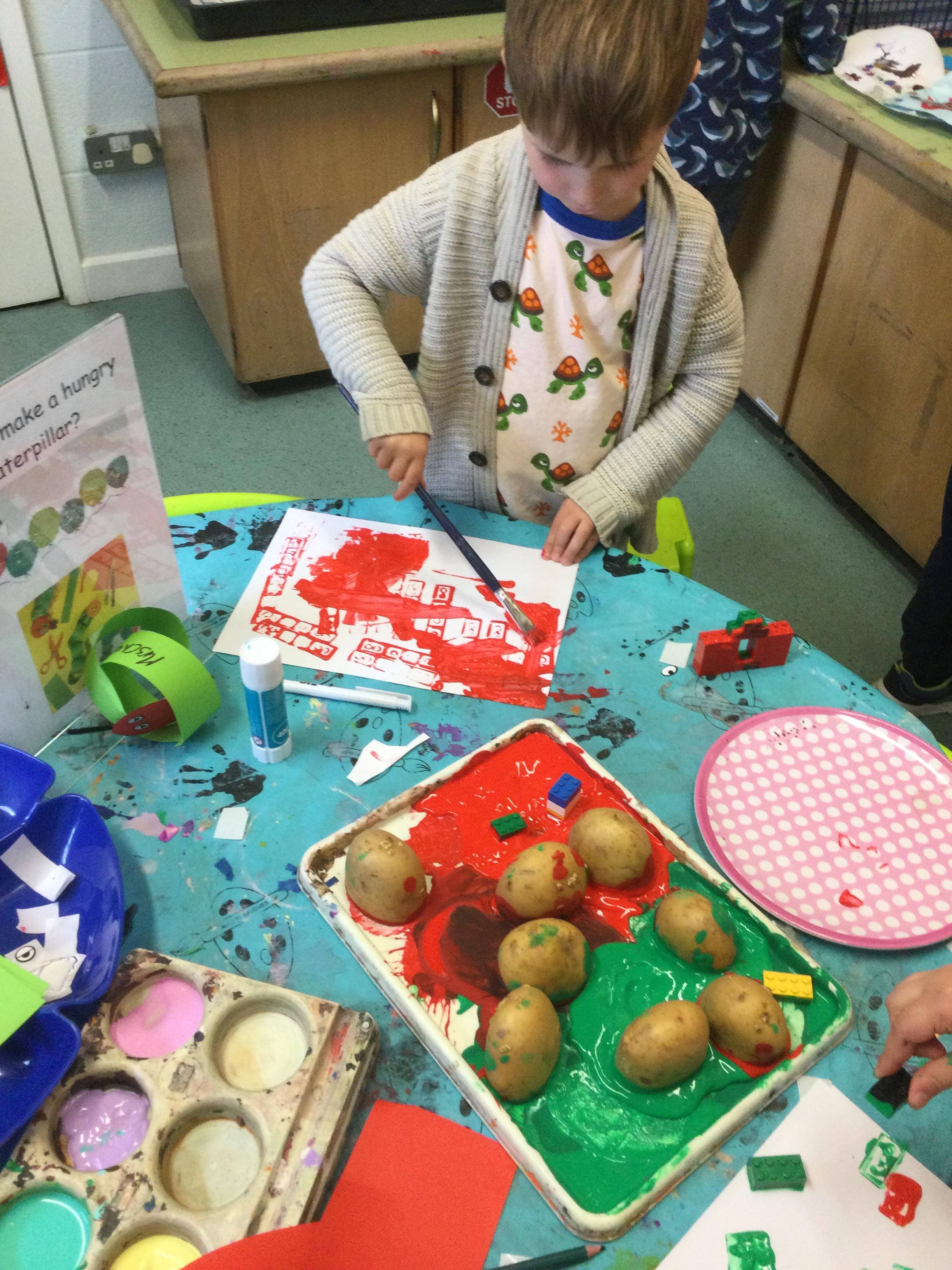 In the art area we made symmetrical butterflies using printing and paint exploring colour mixing at the same time.