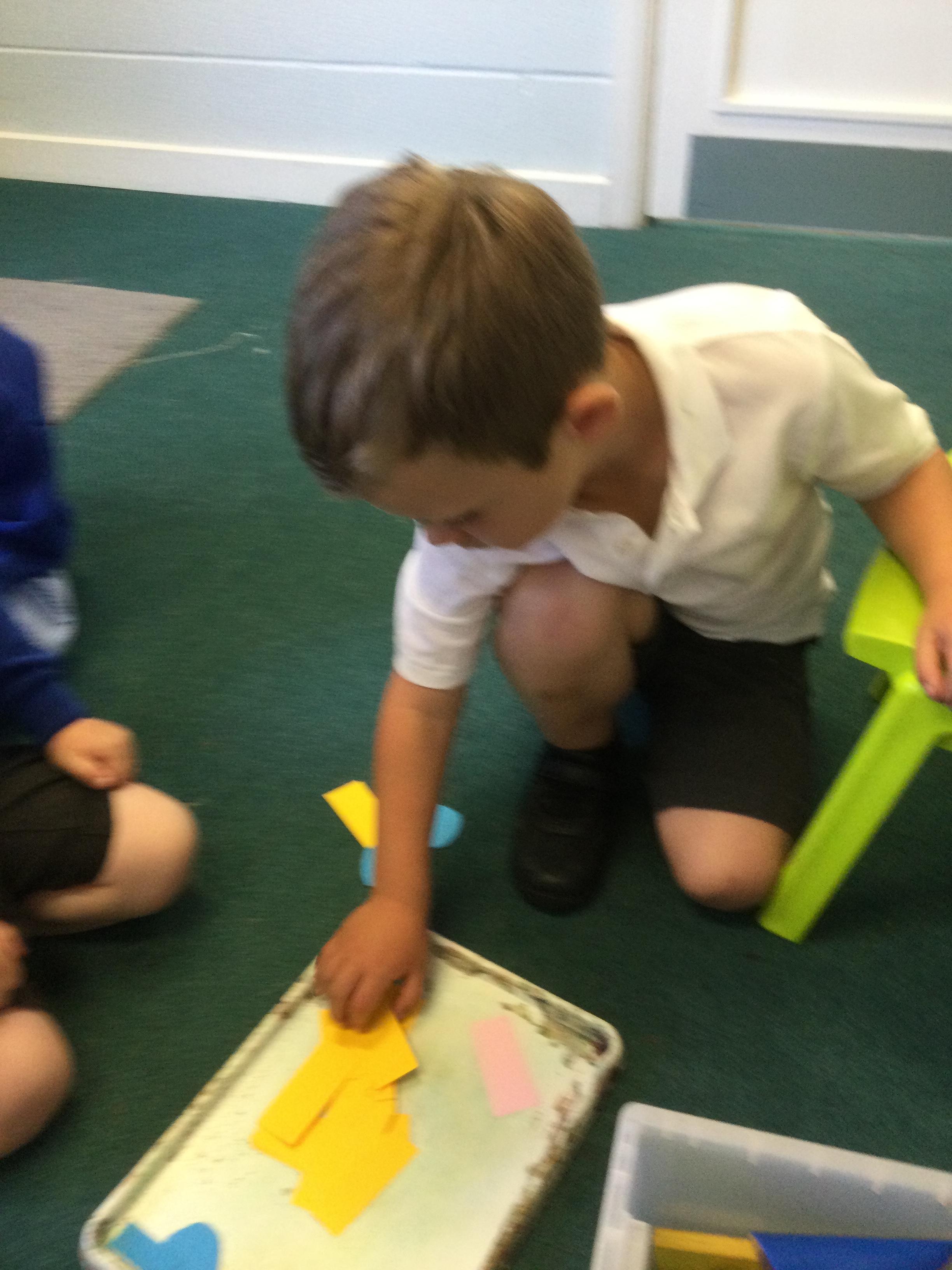 In our maths sessions we have been looking at adding on from a number as well as composing shapes using smaller shapes and then decomposing shapes. We have also been making 2D shape pictures using them .