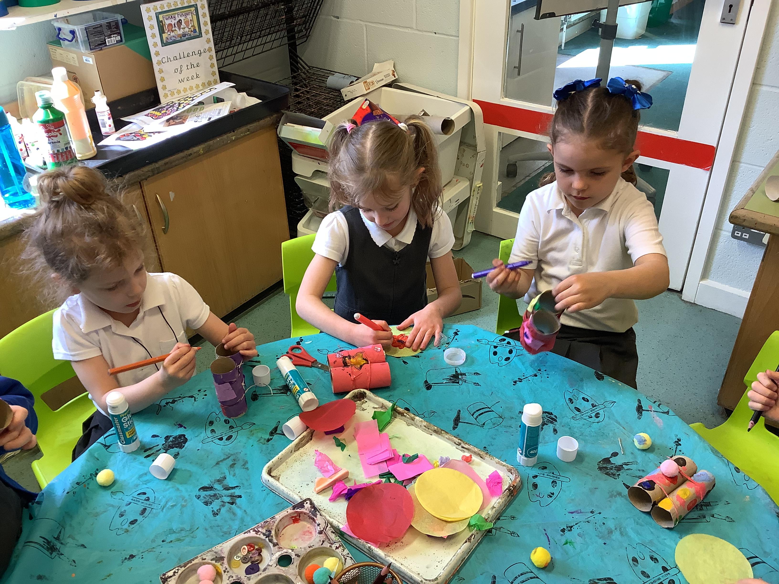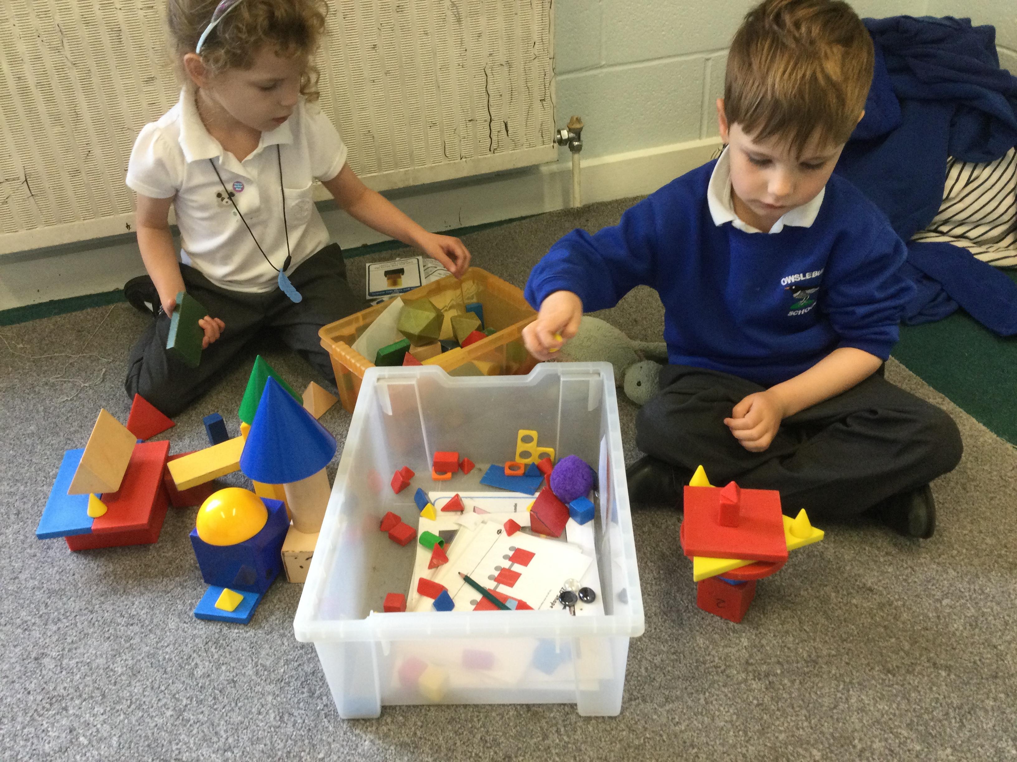In maths sessions we have been comparing and naming 3D shapes as well as forming pictures using them. We played a game where we described shapes and another child had to guess what it was. We have also explored the concept of sharing into groups- we loved sharing out the items for a tea party between Woofy and Angel.