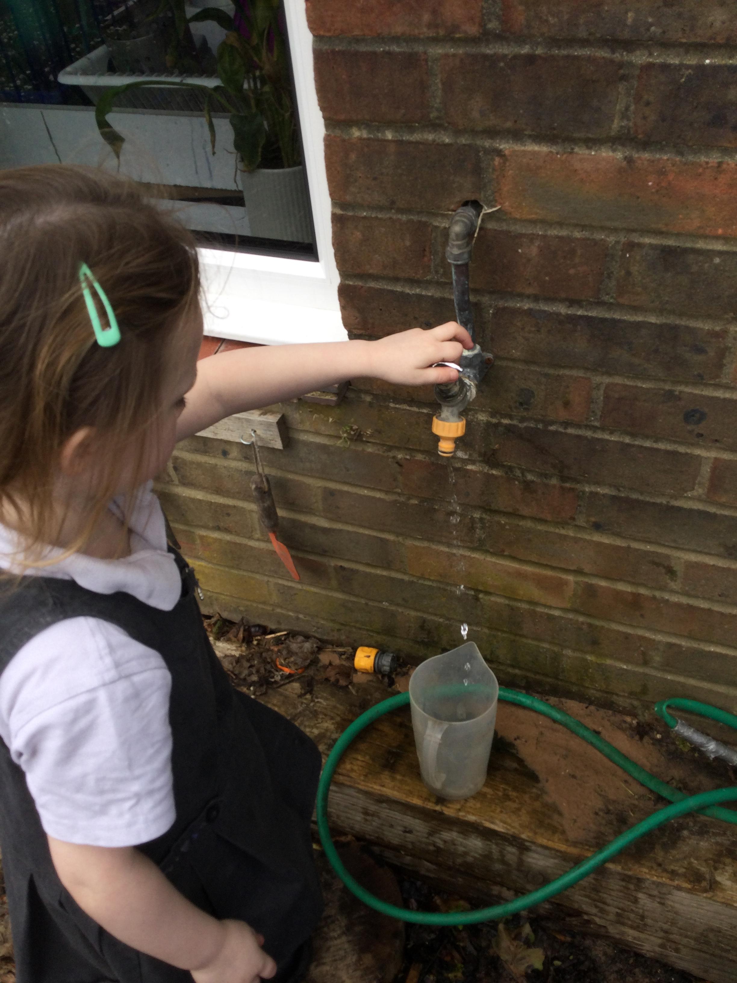 We have been making the most of the lovely weather outside and enjoying the lovely school grounds. The hot weather has meant plenty of water play- squirting letters from the wall, fine motor challenges in the water tray and mixing in the mud kitchen.