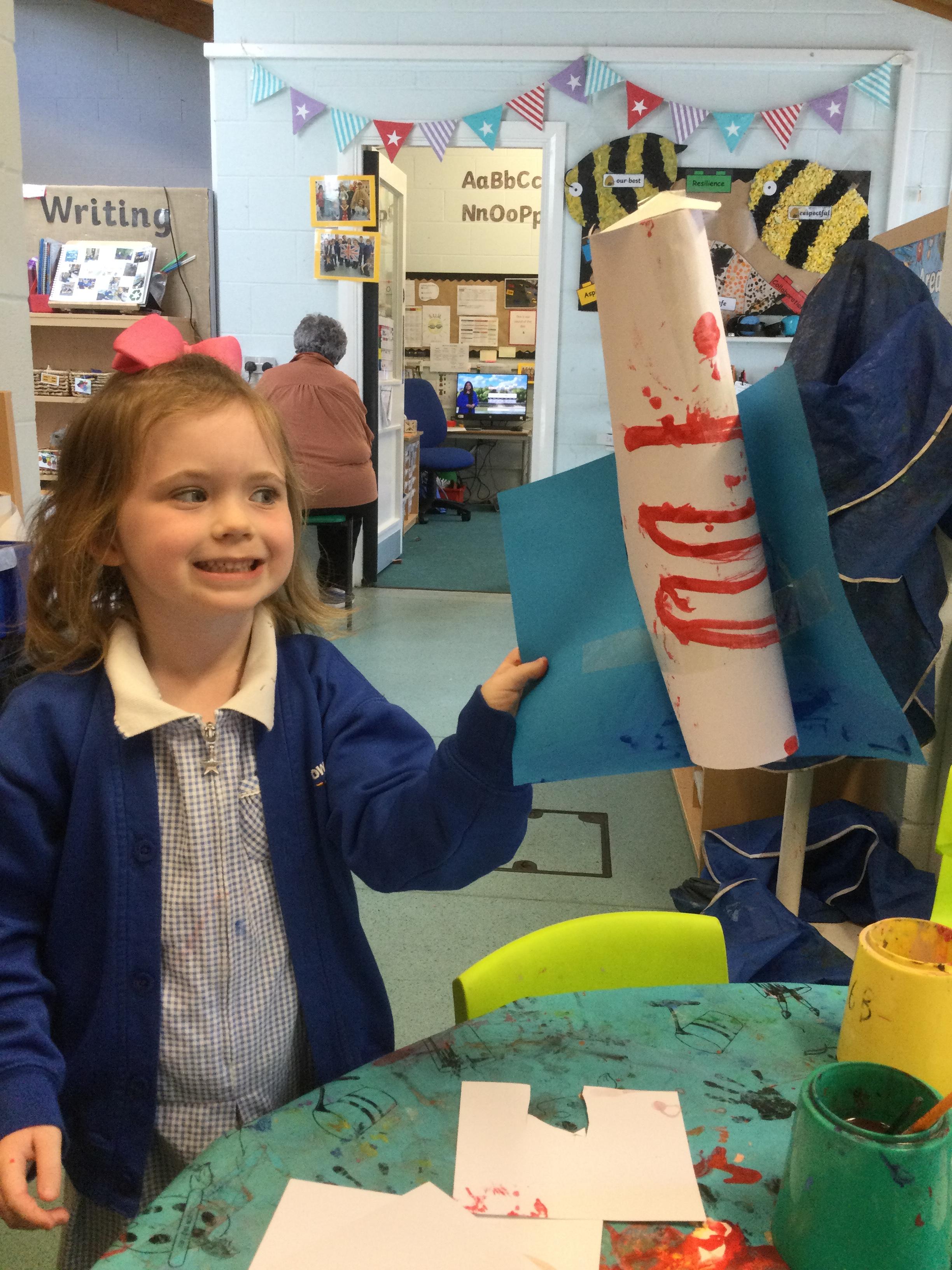 We imagined we were in a submarine and enjoyed a virtual tour together to see the features. This inspired us to build our own submarines outside with the big blocks and record our own submarine diaries. From our story book, we enjoyed acting out scenes in the small world area with some of the creatures. Our water tray was great for exploring the animals that live below the sea. We also enjoyed being creative, painting under the sea on the clingfilm. As with real underwater life, we pretended to be creatures amongst the bubbles.