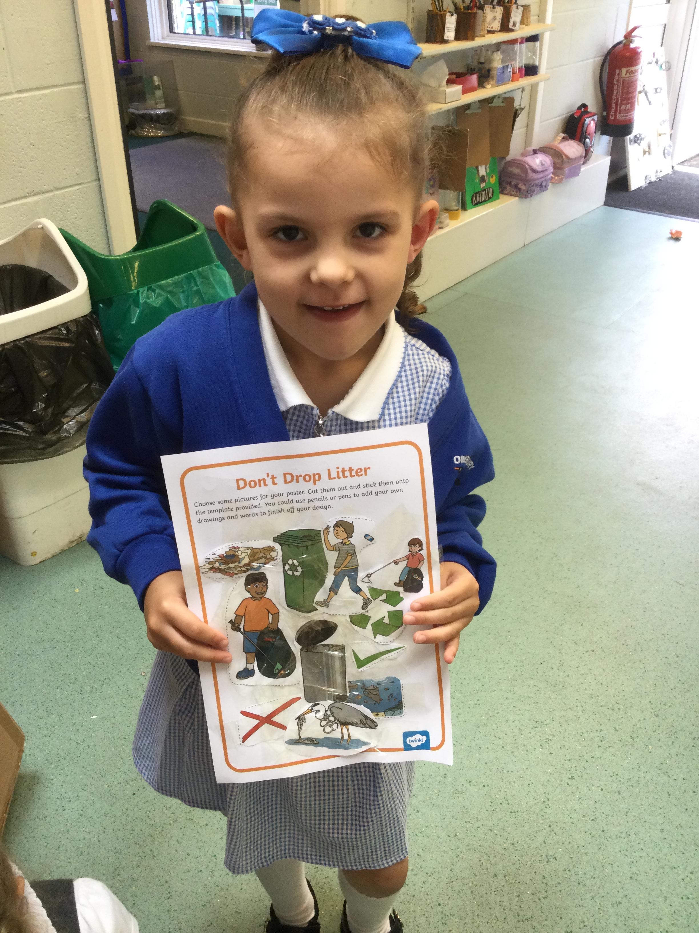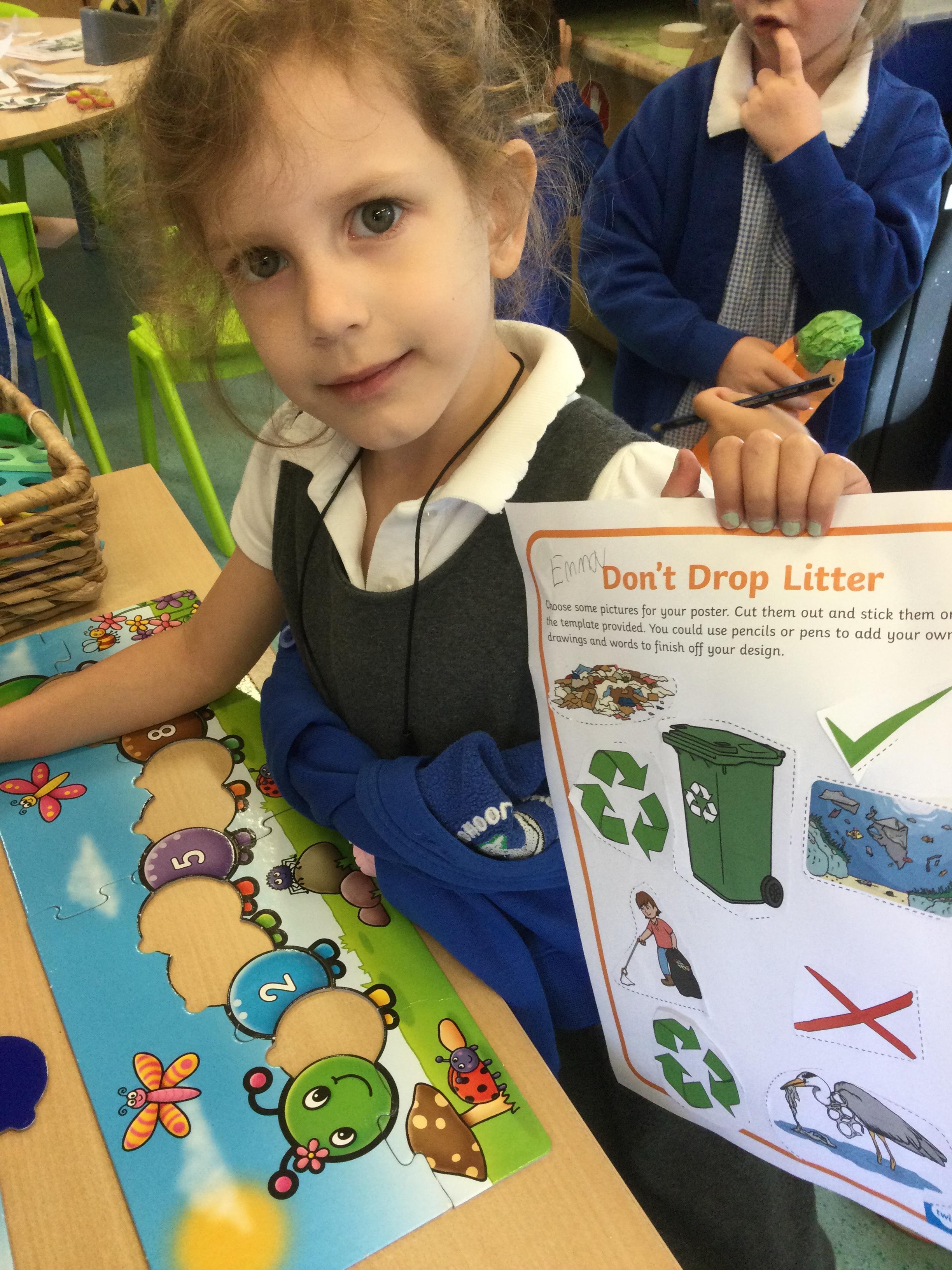 We made anti littering posters in the creative area, started collecting bits for our bug hotel outside and helped put together some new furniture for our outdoor area. The children loved using screw drivers to support us with this! Some of us also used litter pickers in our outdoor area to tidy up our grounds.